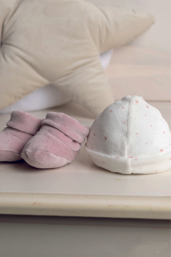 Un set tenero e prezioso composto da cappellino e scarpette, pensato per accogliere con amore i primi giorni del tuo bambino o della tua bambina. Realizzato in morbida ciniglia, tessuto delicato sulla pelle, avvolge con dolcezza garantendo comfort e protezione.