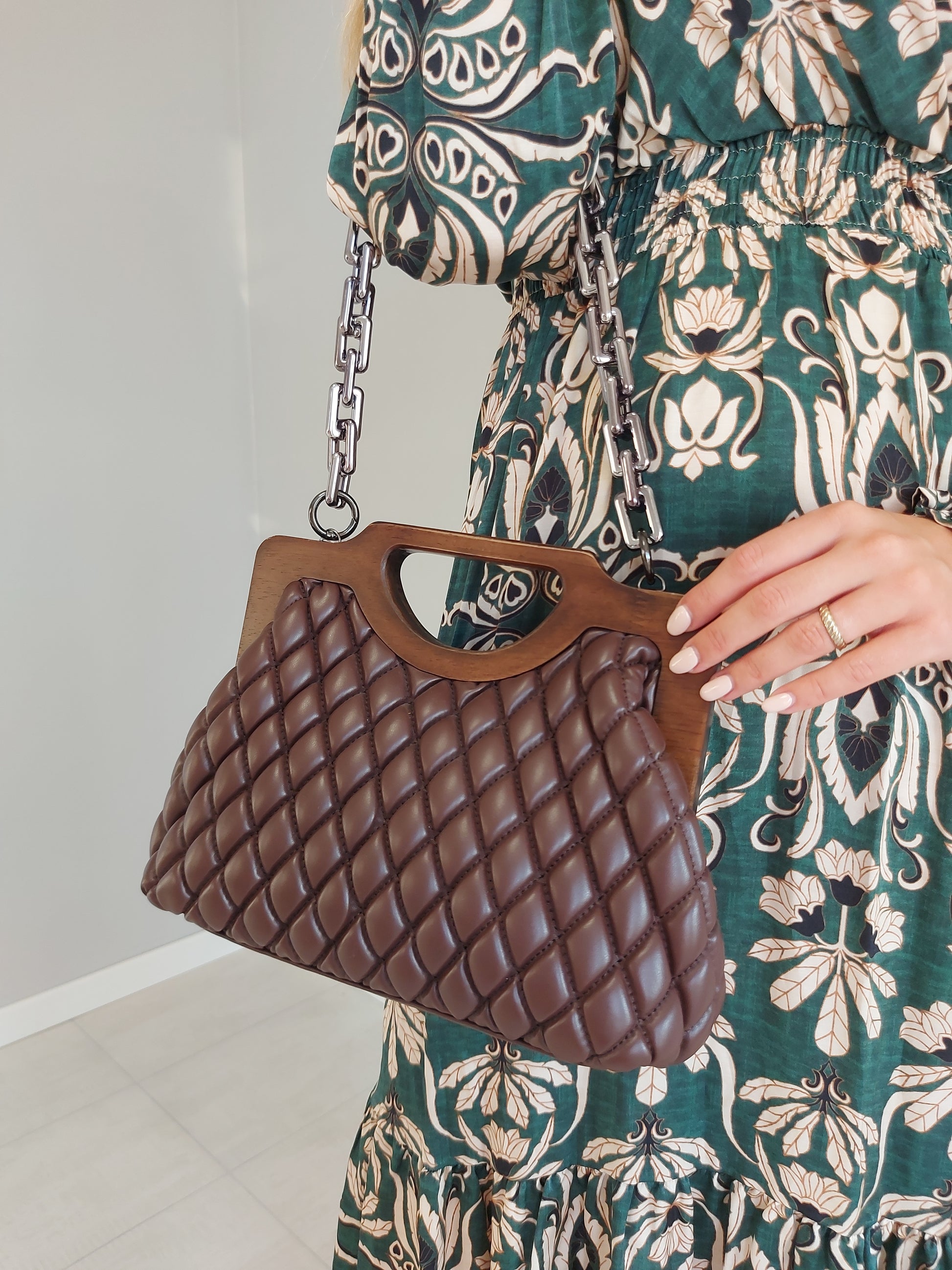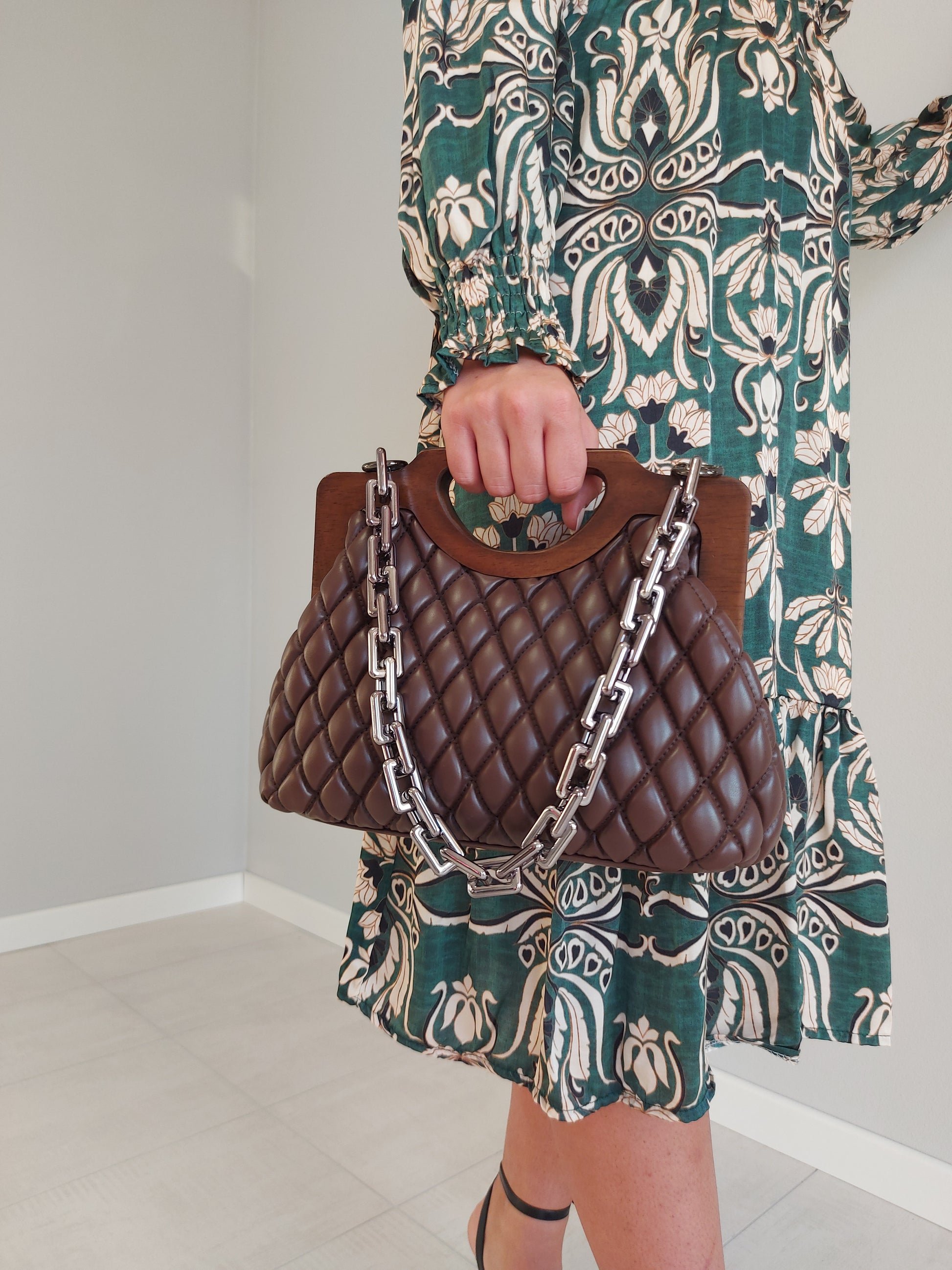 Realizzata con texture trapuntata e manici in effetto legno, questa borsa a mano è al contempo pratica e raffinata. È impreziosita dalla catenella in metallo argento e da un interno capiente che assicura la massima versatilità.