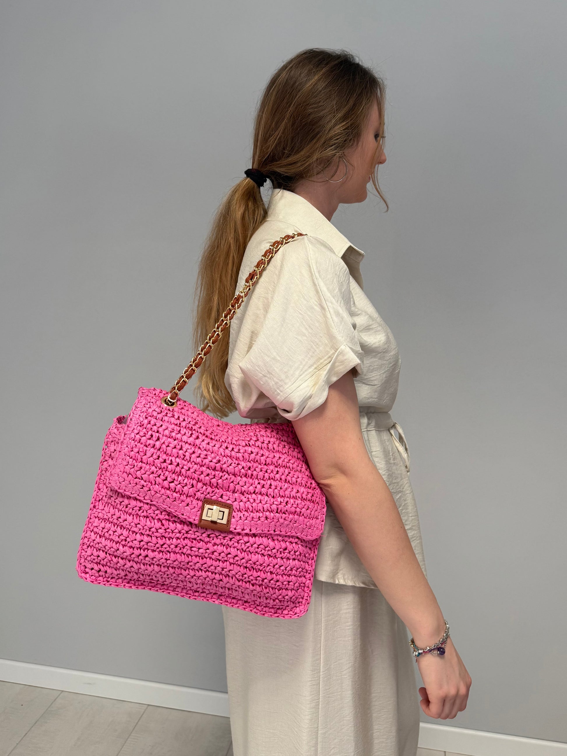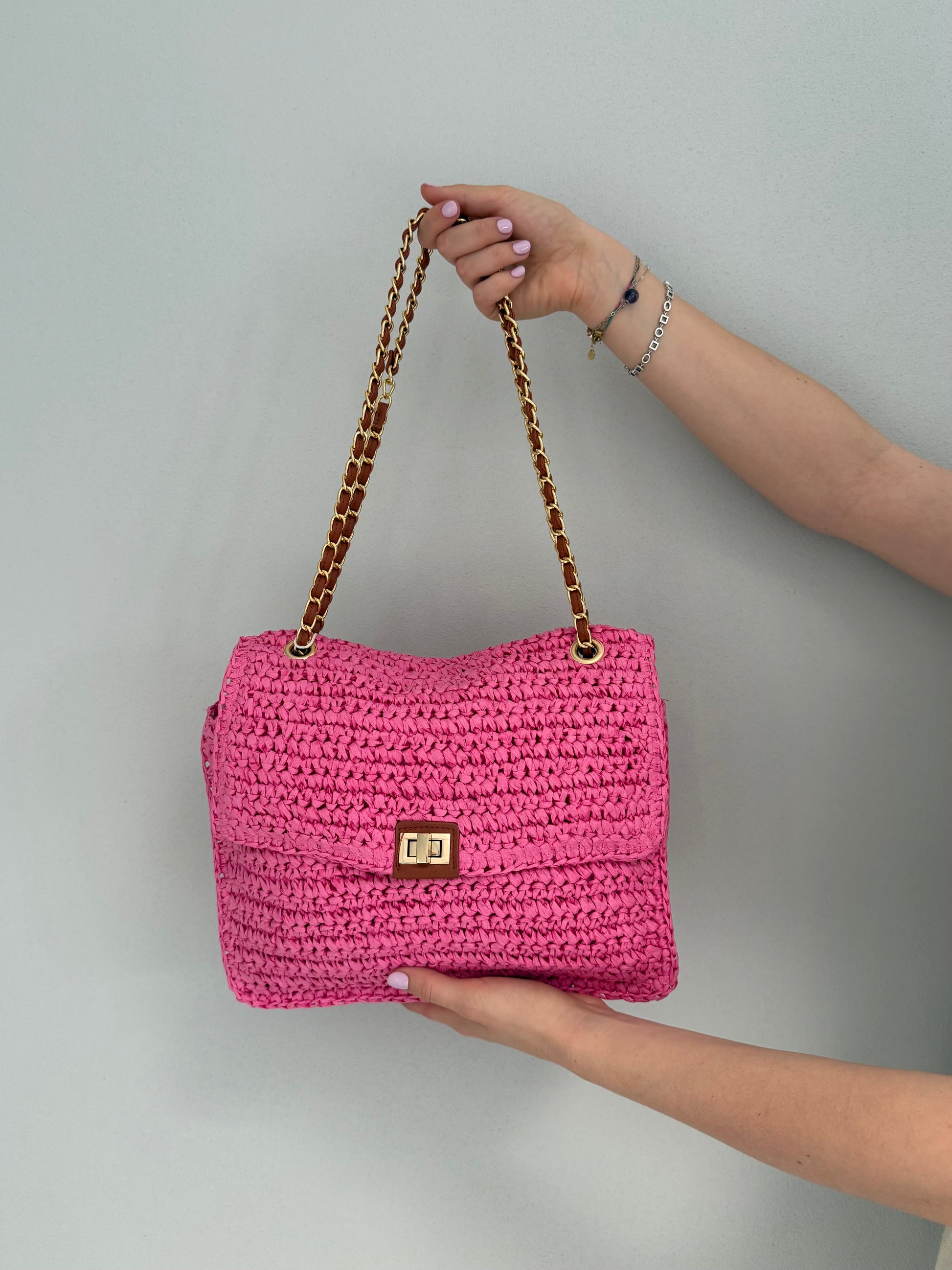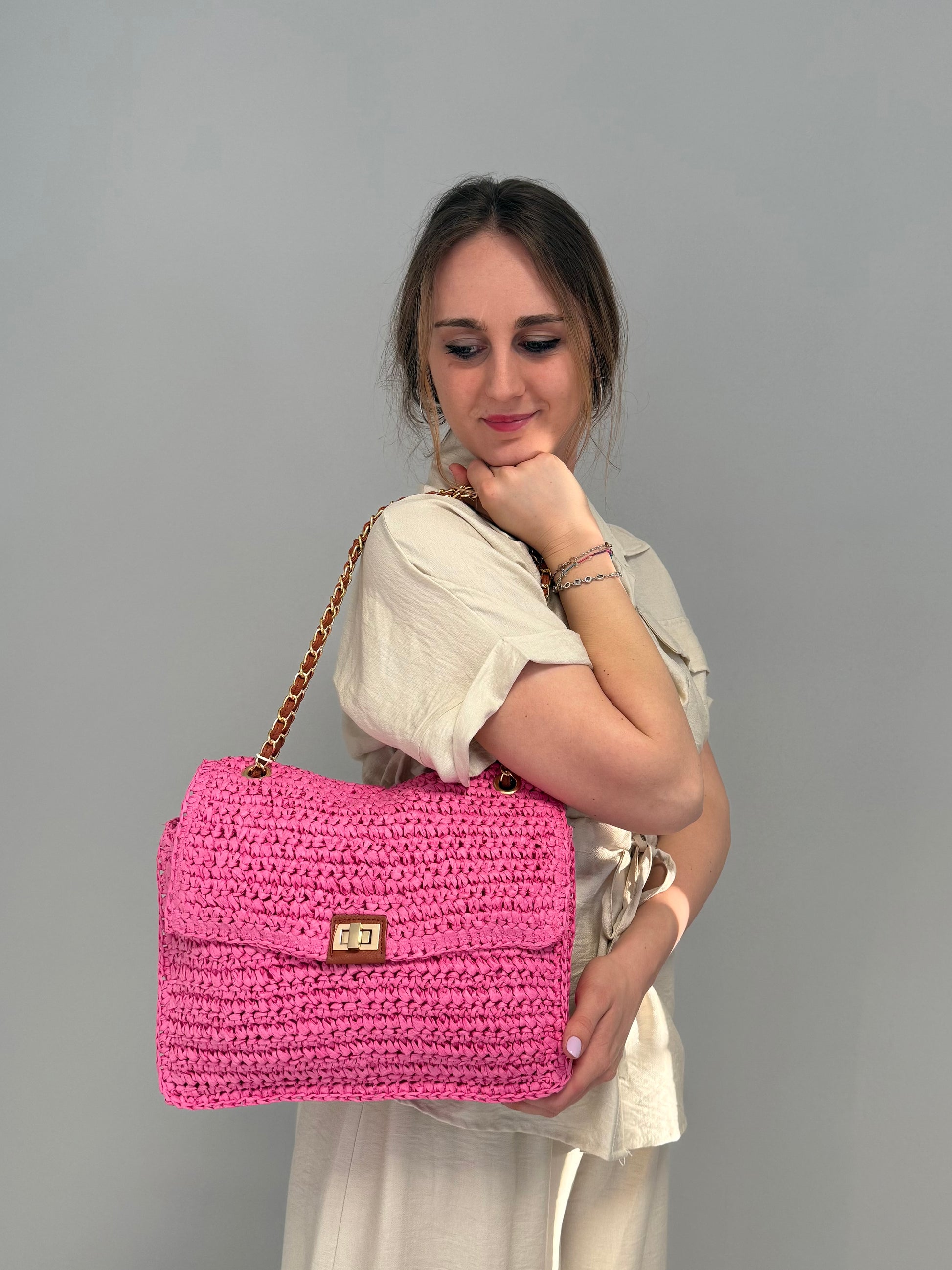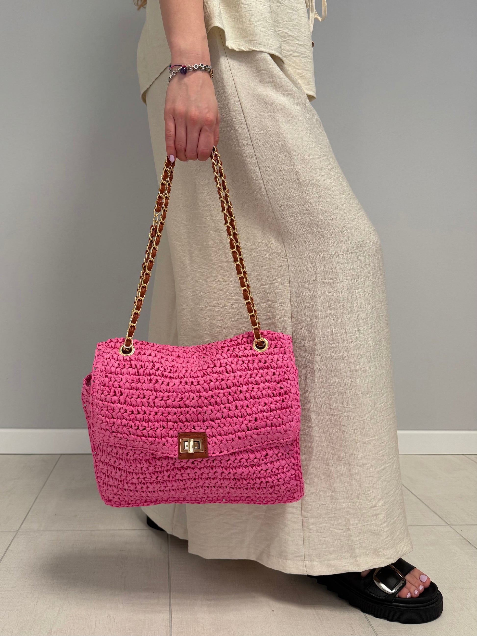 Dona un tocco di freschezza e stile ai tuoi look estivi con questa splendida borsa a spalla color fucsia acceso. Perfetta per illuminare qualsiasi outfit, questa borsa presenta texture intrecciata con un design moderno e vivace. La catenella dorata la rende pratica da portare a spalla, aggiungendo un dettaglio chic e raffinato.