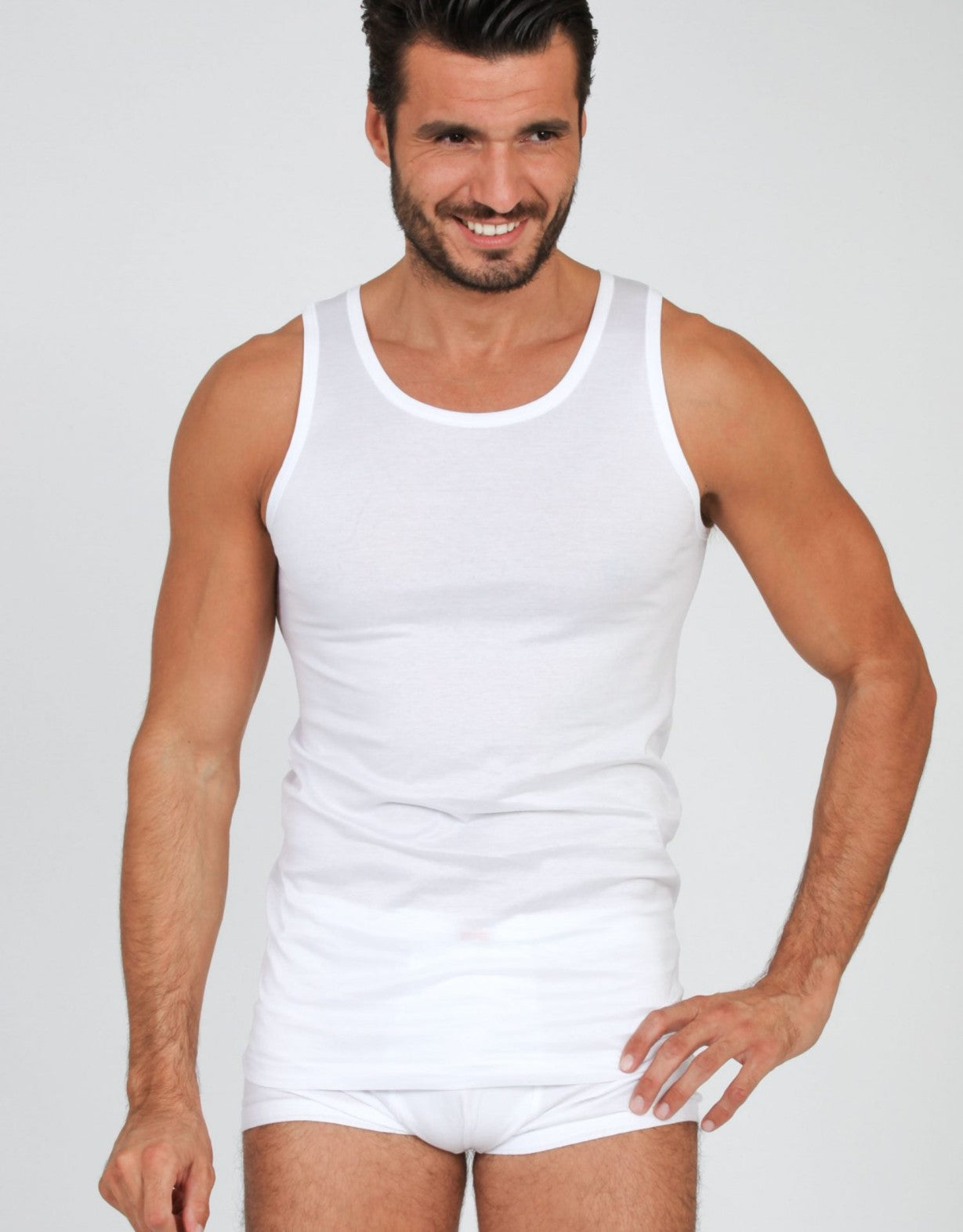 Canotta da uomo con spalla larga realizzata in pregiato filo di Scozia 5300. Il tessuto garantisce morbidezza, traspirabilità e durabilità nel tempo, perfetto per l'uso quotidiano in ogni stagione. La vestibilità comoda con spalle ampie assicura libertà di movimento e comfort superiore. Un capo essenziale e versatile da indossare da solo o in abbinamento con altri capi del tuo guardaroba.
