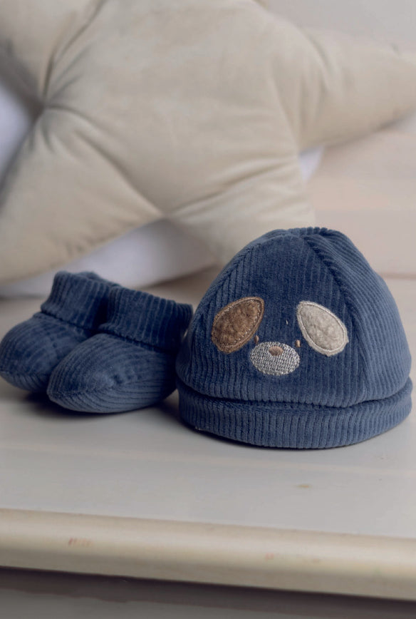 Un set tenero e prezioso composto da cappellino e scarpette, pensato per accogliere con amore i primi giorni del tuo bambino o della tua bambina. Realizzato in morbida ciniglia, tessuto delicato sulla pelle, avvolge con dolcezza garantendo comfort e protezione.