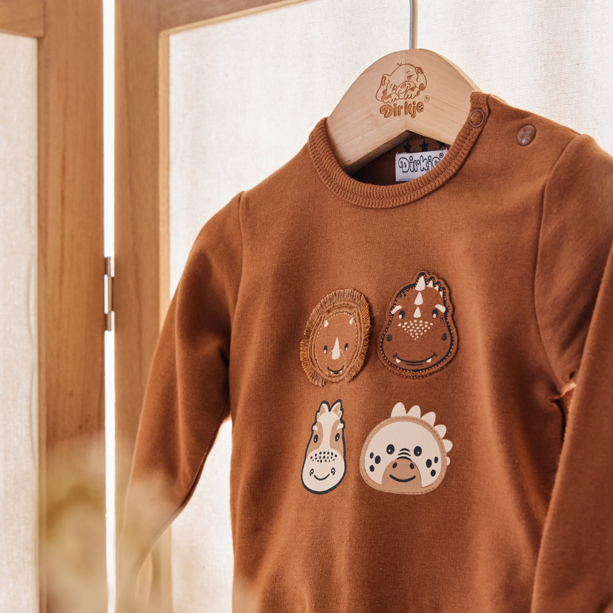 Aggiungi un tocco di stile al guardaroba del tua piccolo con questa splendido set composto da maglietta maniche lunghe, pantaloncini e giacca firmata Dirkje. Realizzata in morbido cotone, questo set cognac si distingue per i dinosauri stampati sulla maglietta, per un look unico e sofisticato. Perfetta per le giornate più fresche, combina comfort e design moderno. Ideale per abbinamenti casual o più eleganti, è la scelta ideale per ogni occasione. Scopri la qualità del marchio olandese Dirkje e lasciati ispirare dal suo stile inconfondibile.