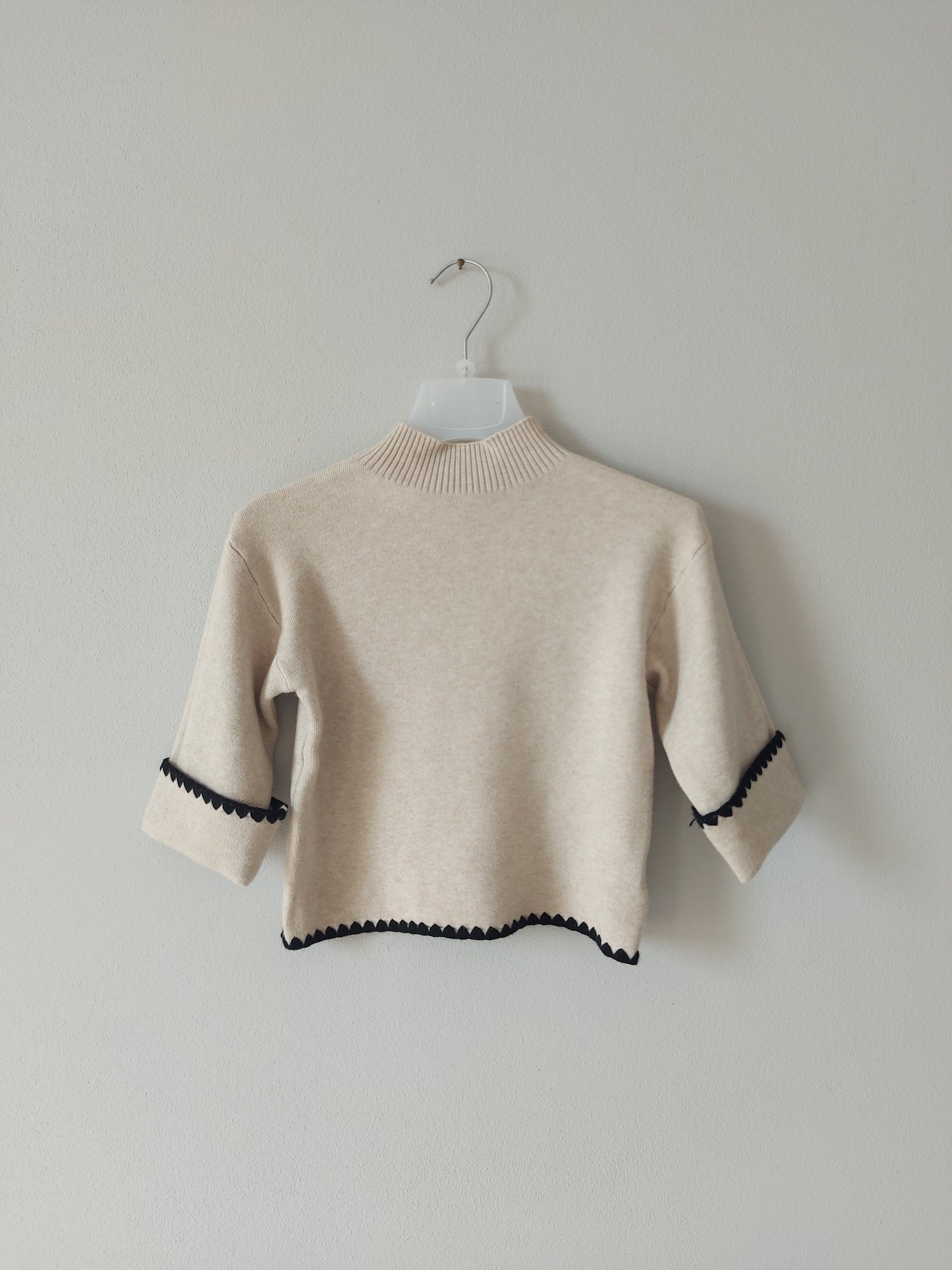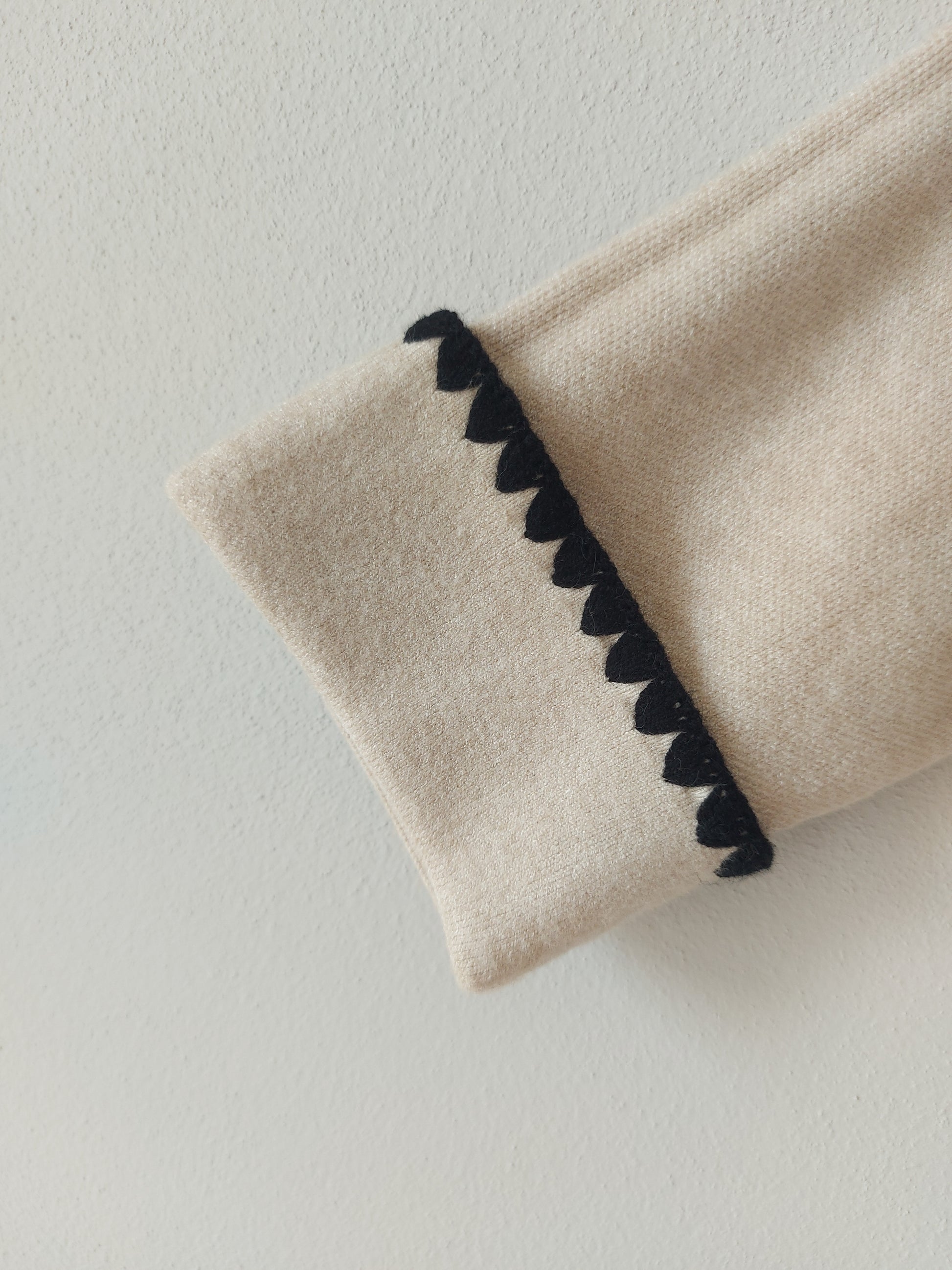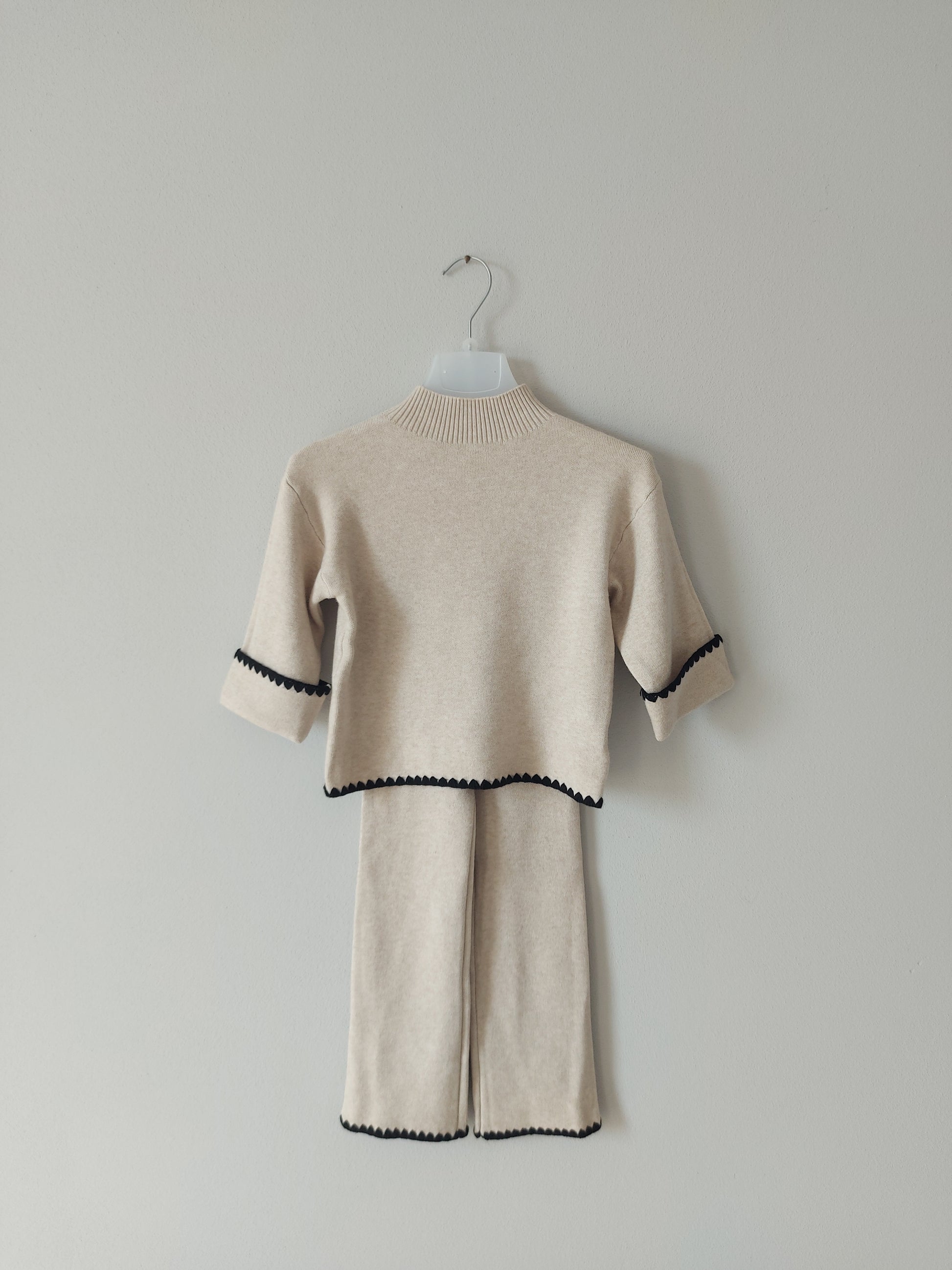 Questo set coordinato in maglia è la scelta perfetta per vestire la tua bambina con stile e comfort in ogni occasione! Il completo, composto da un maglioncino a maniche tre quarti e pantaloni abbinati, è realizzato in una morbida maglia color crema che avvolge delicatamente il corpo, garantendo libertà di movimento e calore. I dettagli neri a contrasto lungo i bordi aggiungono un tocco di raffinatezza, rendendo questo outfit ideale per momenti speciali o per un look casual chic. Versatile e adorabile, questo set è un must-have per il guardaroba autunnale e invernale, perfetto per le bambine che amano sentirsi comode senza rinunciare all’eleganza!