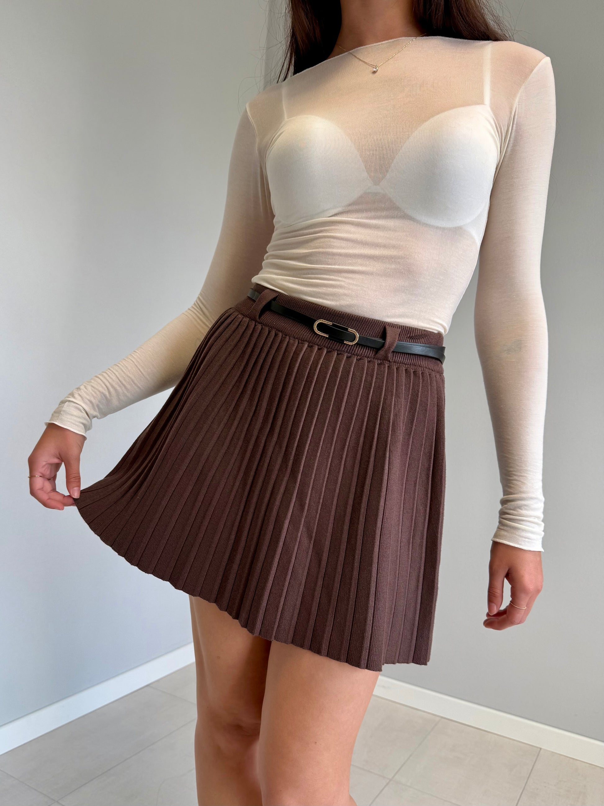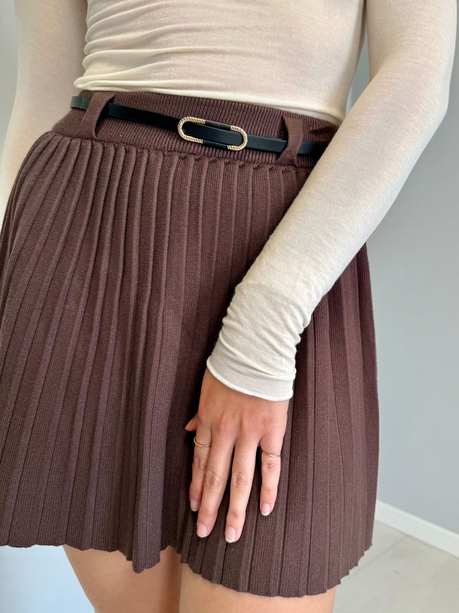 Trendy e super femminile, questa minigonna plissettata in maglia è il must-have di stagione per ragazze che amano distinguersi con stile. Realizzata in un morbido tessuto elasticizzato, si adatta perfettamente alle forme mantenendo un comfort ideale per ogni momento della giornata. I passanti in vita e la cintura coordinata inclusa completano il look, regalando un tocco fashion e curato nei dettagli.