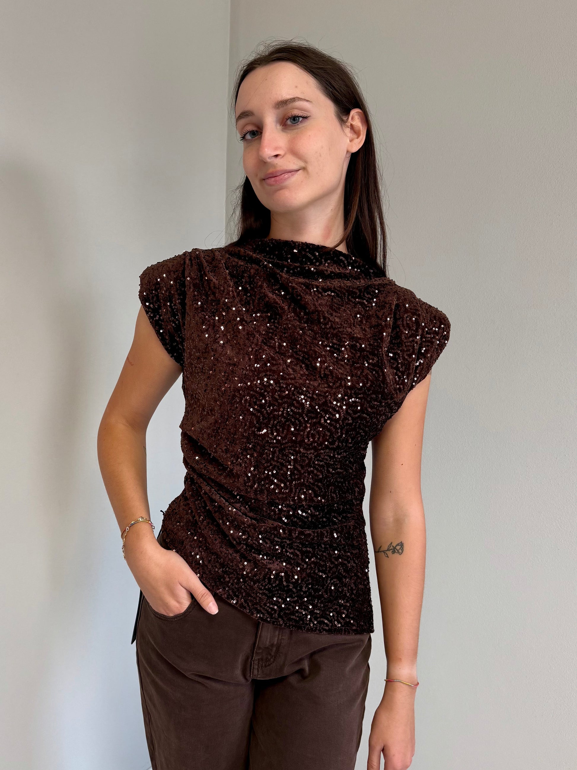Brilla con stile con questo esclusivo top a mezza manica con spalline imbottite e vestibilità sfiancata, pensato per valorizzare la silhouette femminile. Realizzato con paillettes marroni scintillanti su tutta la superficie, è il capo perfetto per aggiungere un tocco glamour e sofisticato ai tuoi look da sera o per le occasioni speciali.