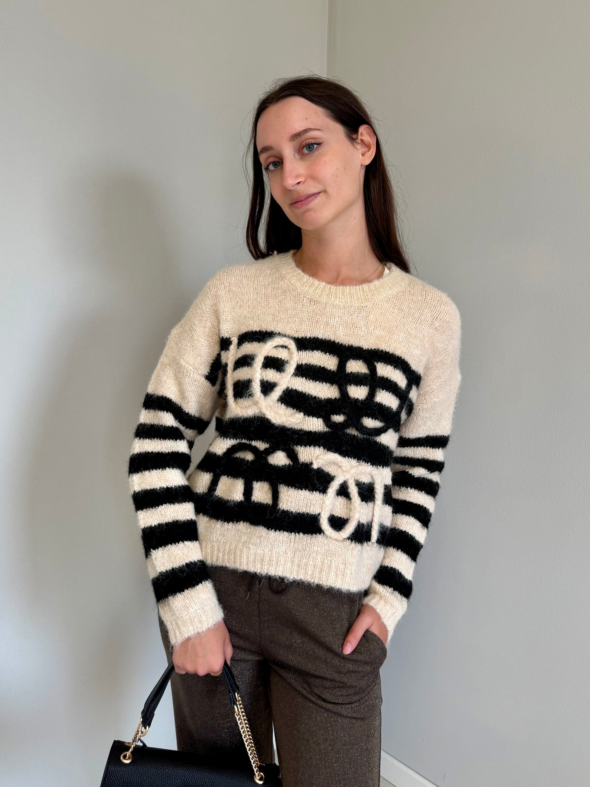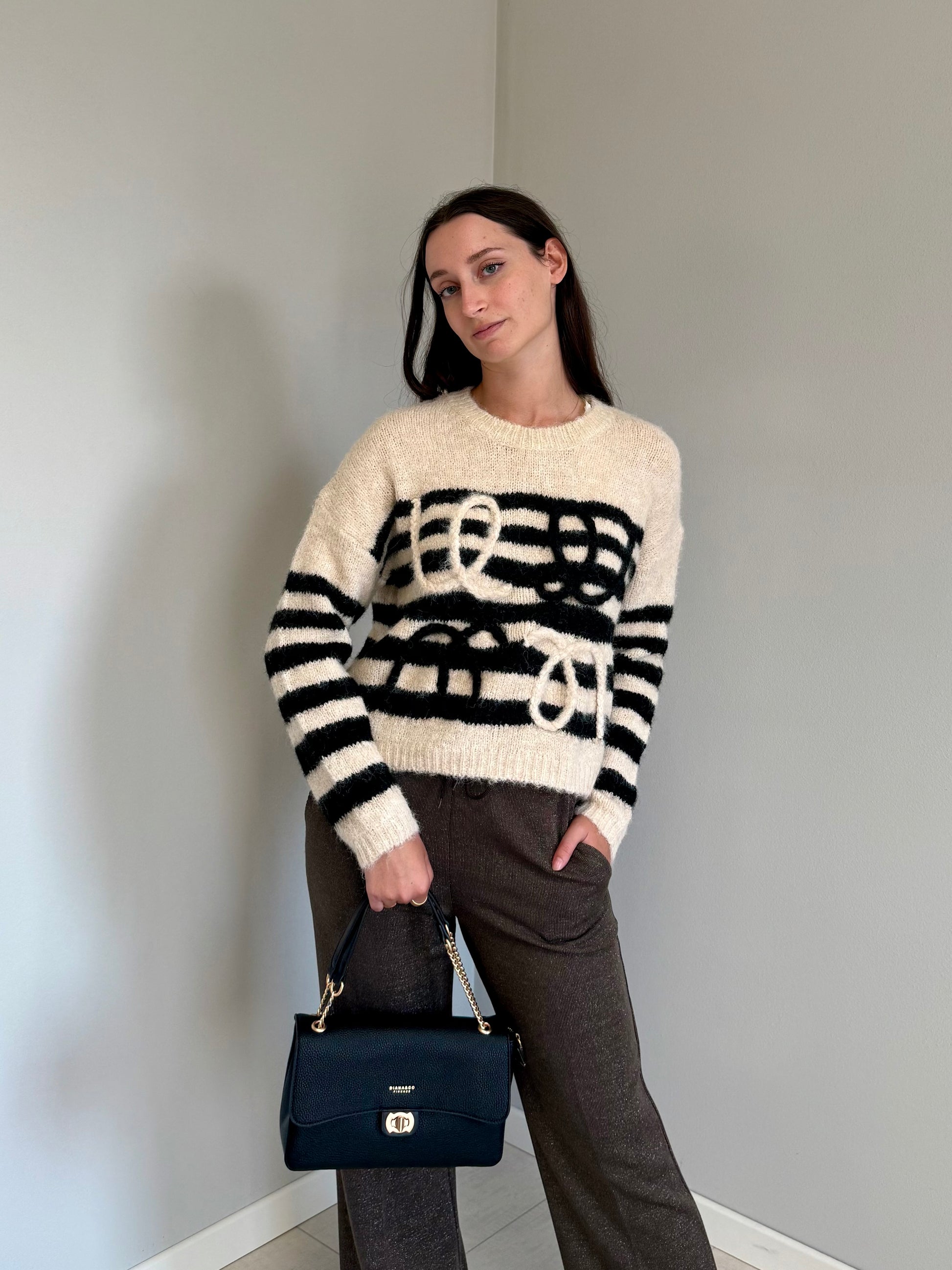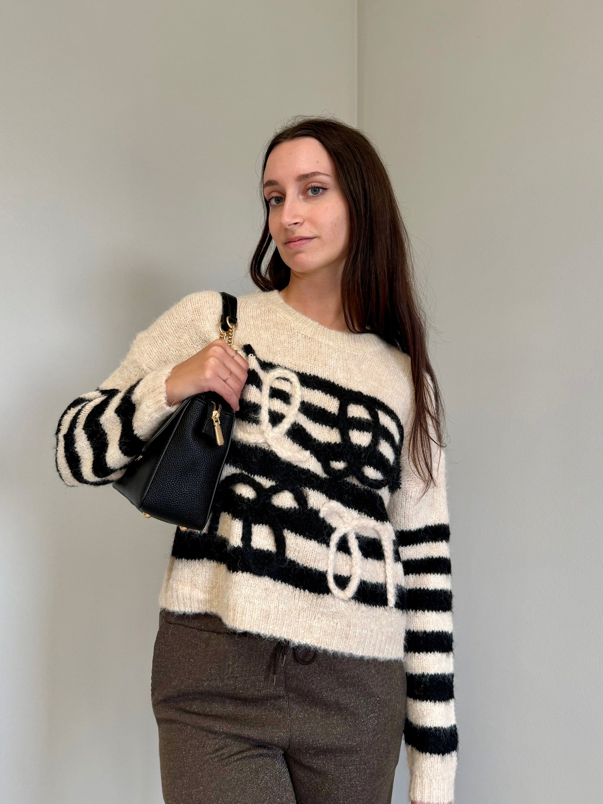 Decorato con fantasia a righe bianche e nere dona un tocco trendy e originale le, rendendolo ideale sia per occasioni casual che più eleganti. Le maniche lunghe e la vestibilità comoda lo rendono un capo versatile, perfetto da abbinare a jeans o pantaloni classici. Scegli questo maglione per un look caldo, confortevole e chic.