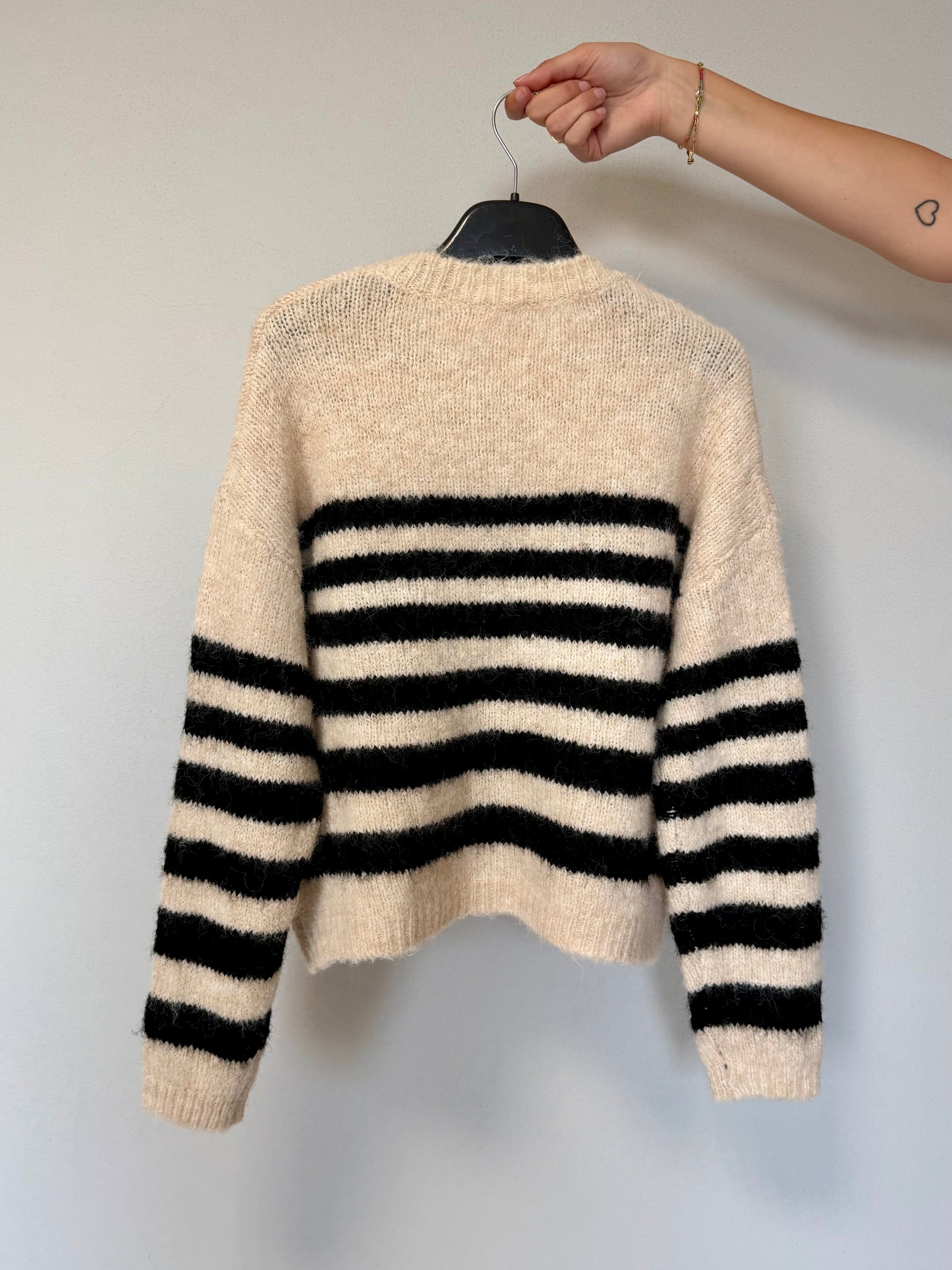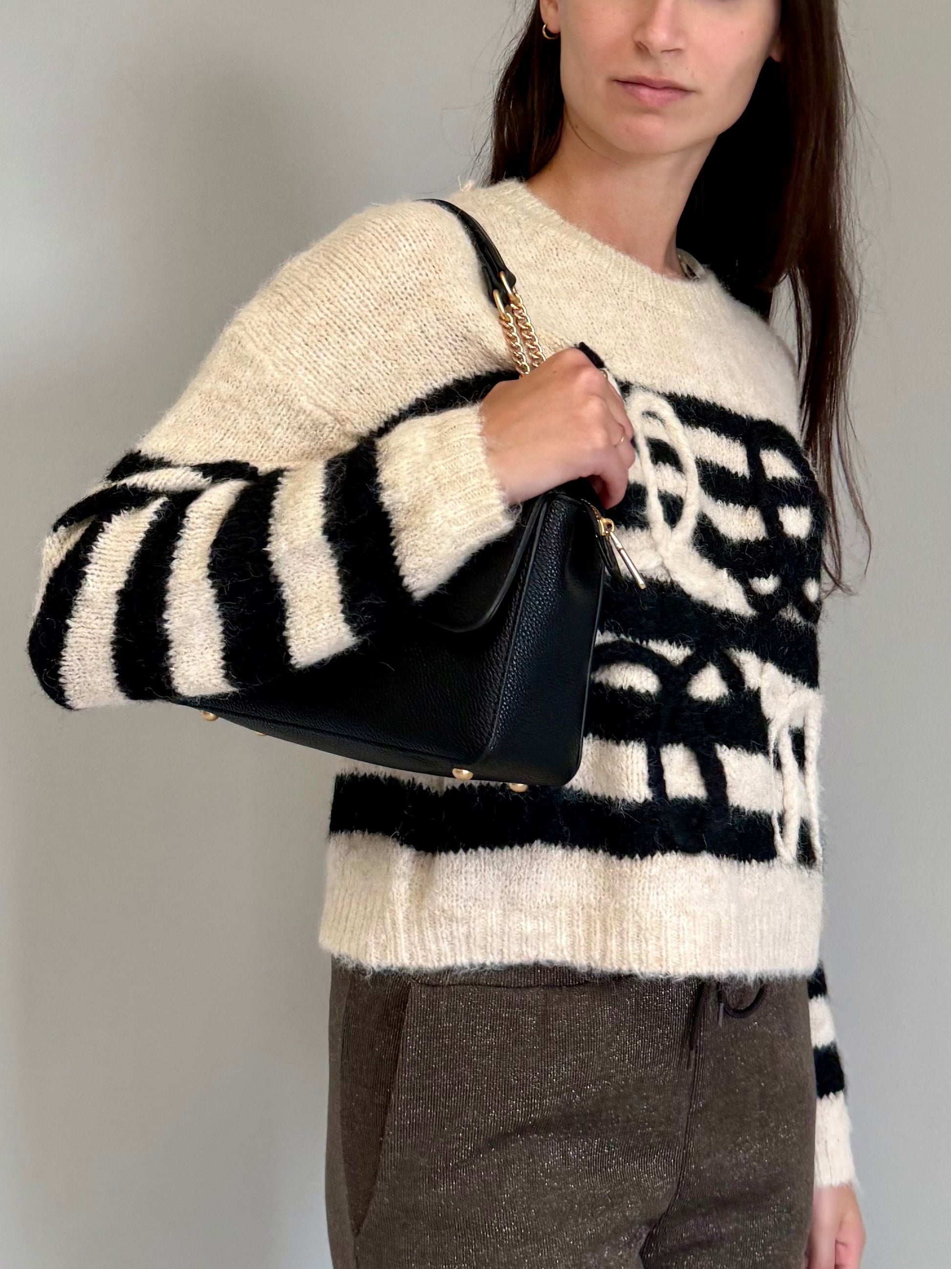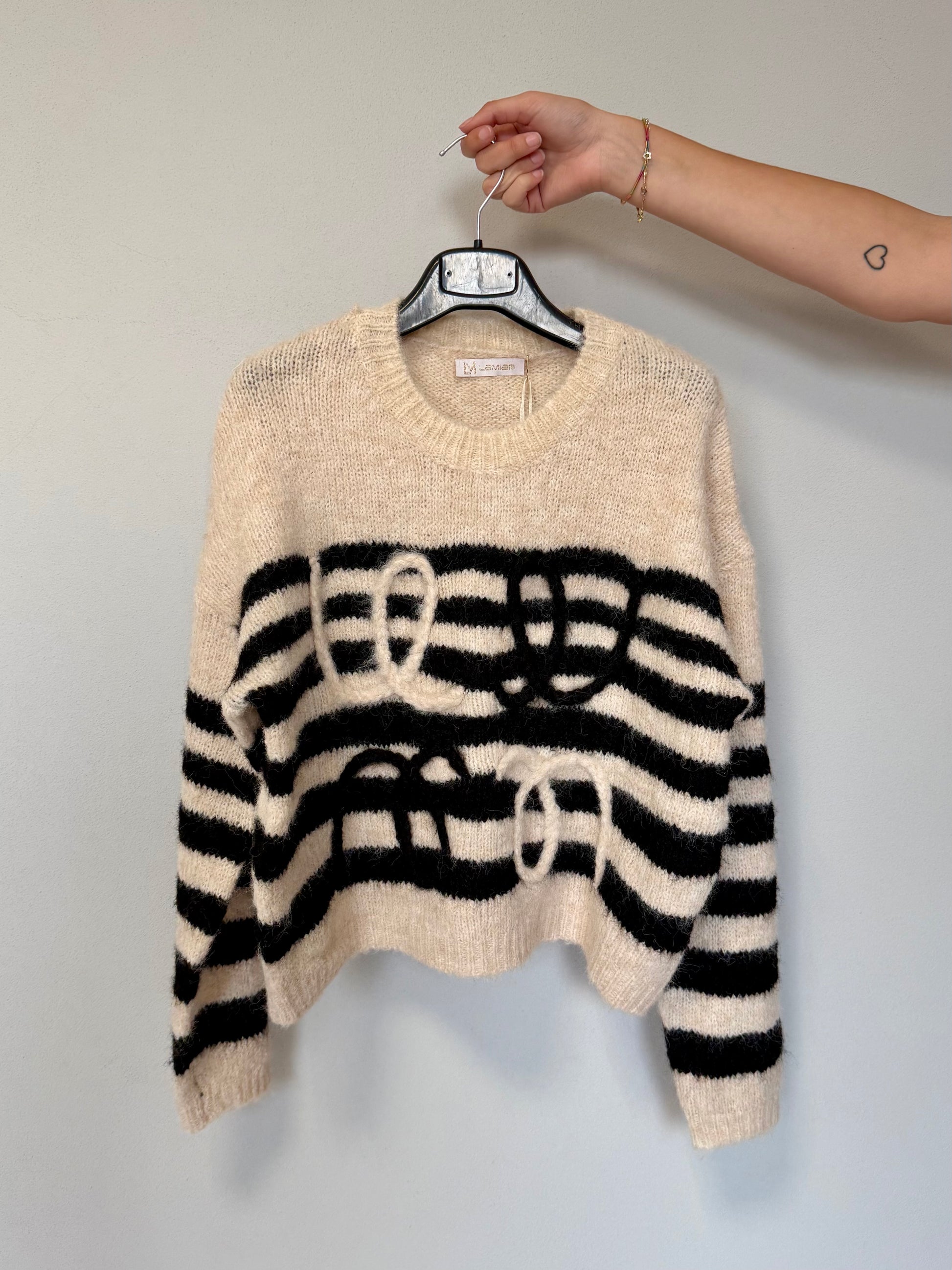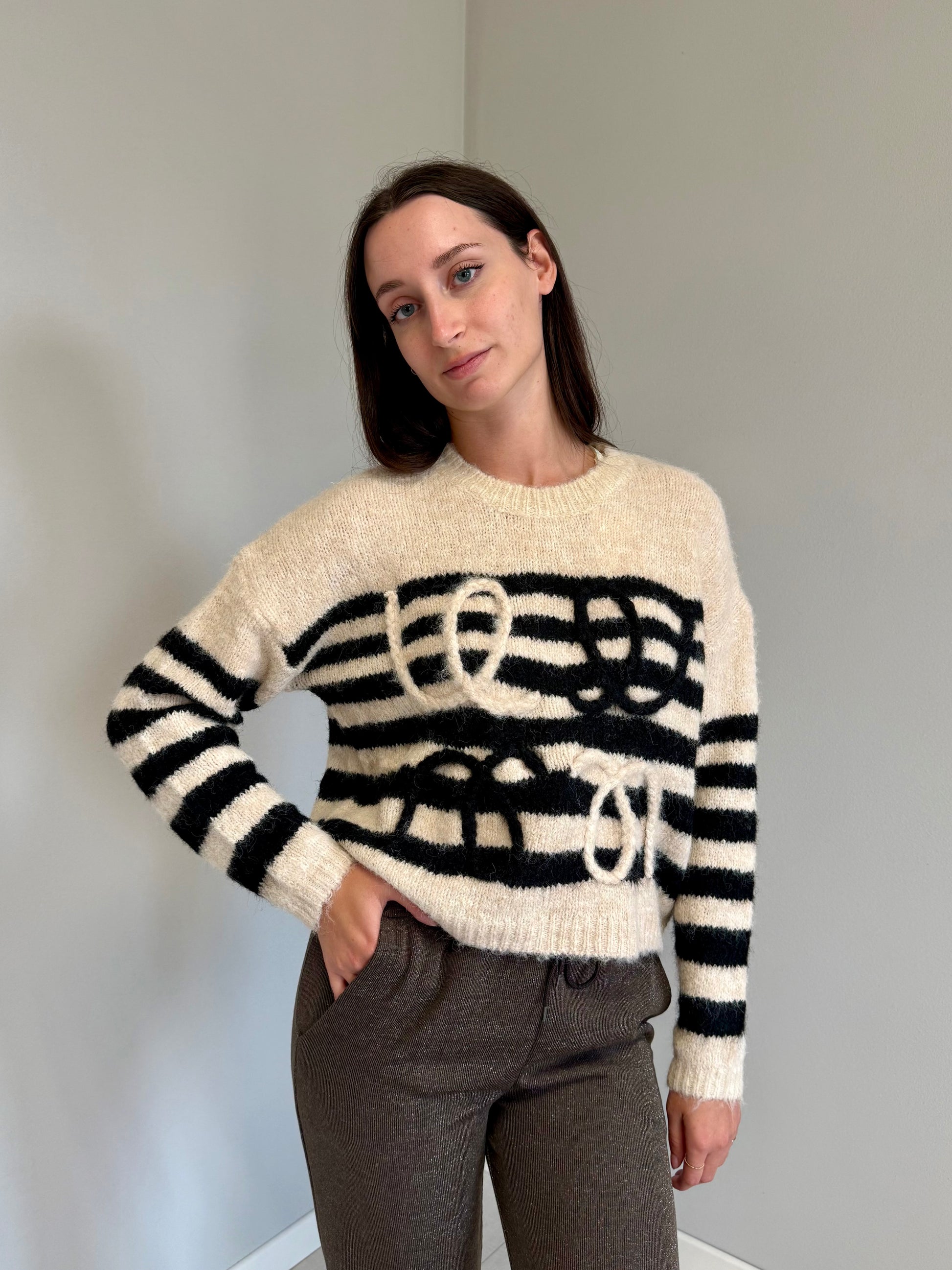 Decorato con fantasia a righe bianche e nere dona un tocco trendy e originale le, rendendolo ideale sia per occasioni casual che più eleganti. Le maniche lunghe e la vestibilità comoda lo rendono un capo versatile, perfetto da abbinare a jeans o pantaloni classici. Scegli questo maglione per un look caldo, confortevole e chic.