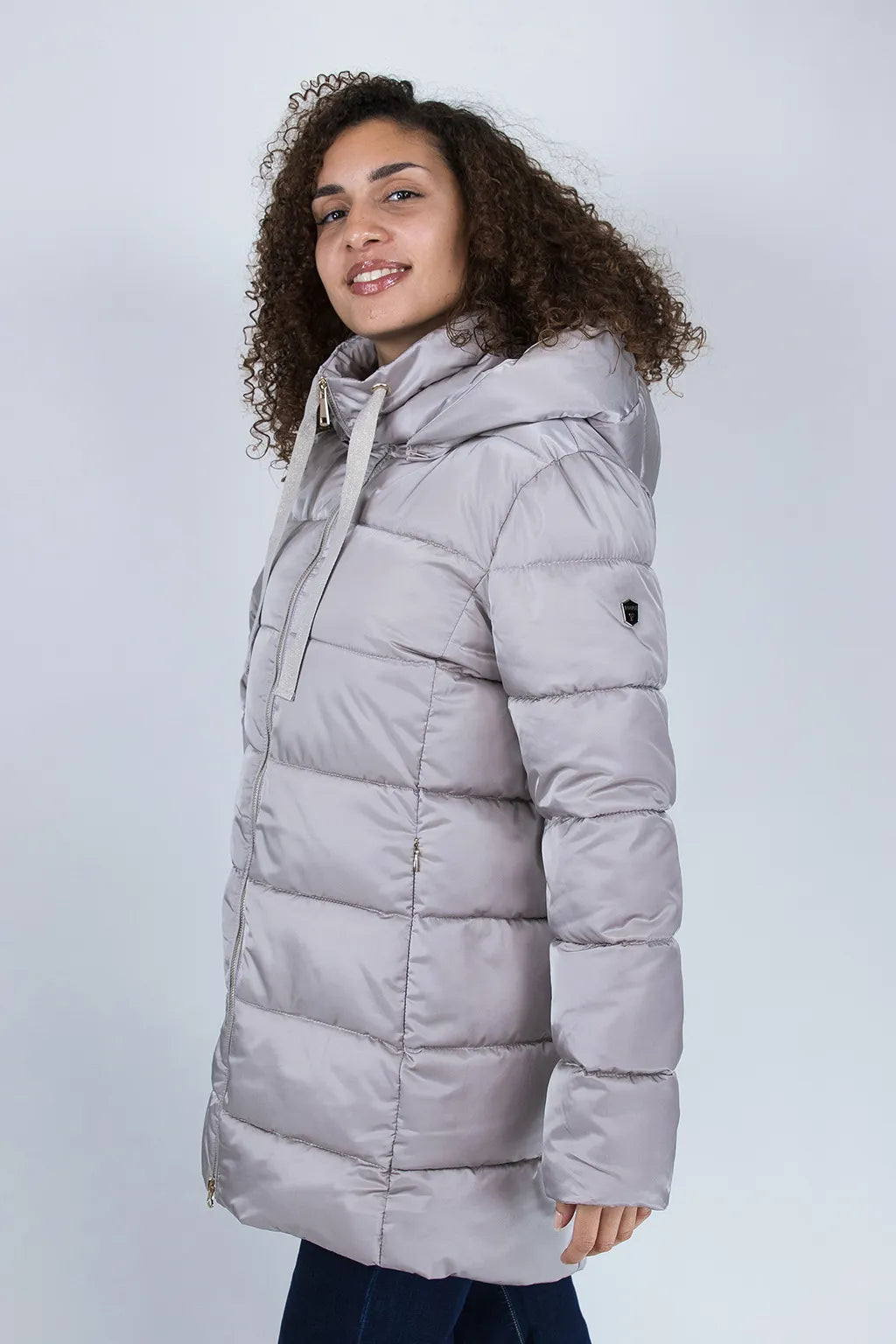 L’imbottitura in poliestere riciclato garantisce calore e comfort, rispettando al tempo stesso l’ambiente. Il taglio leggermente più lungo sul retro aggiunge un tocco femminile e sofisticato, mentre la zip dorata a doppio cursore regala un dettaglio chic e funzionale.