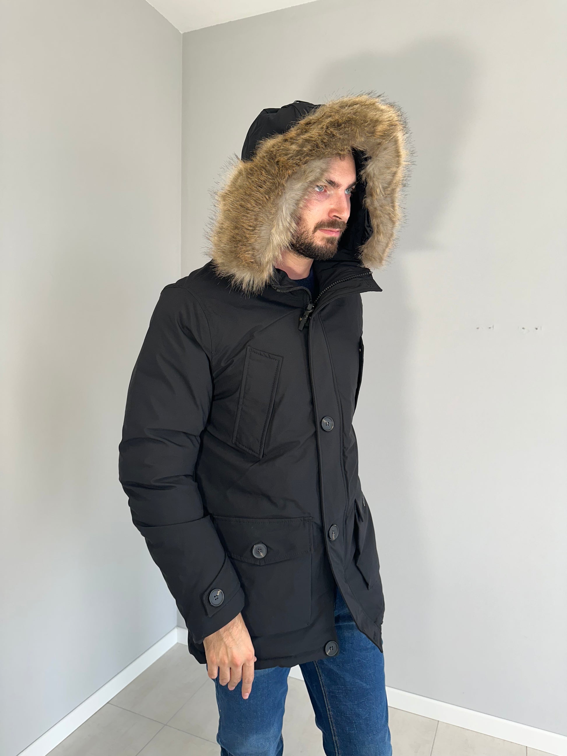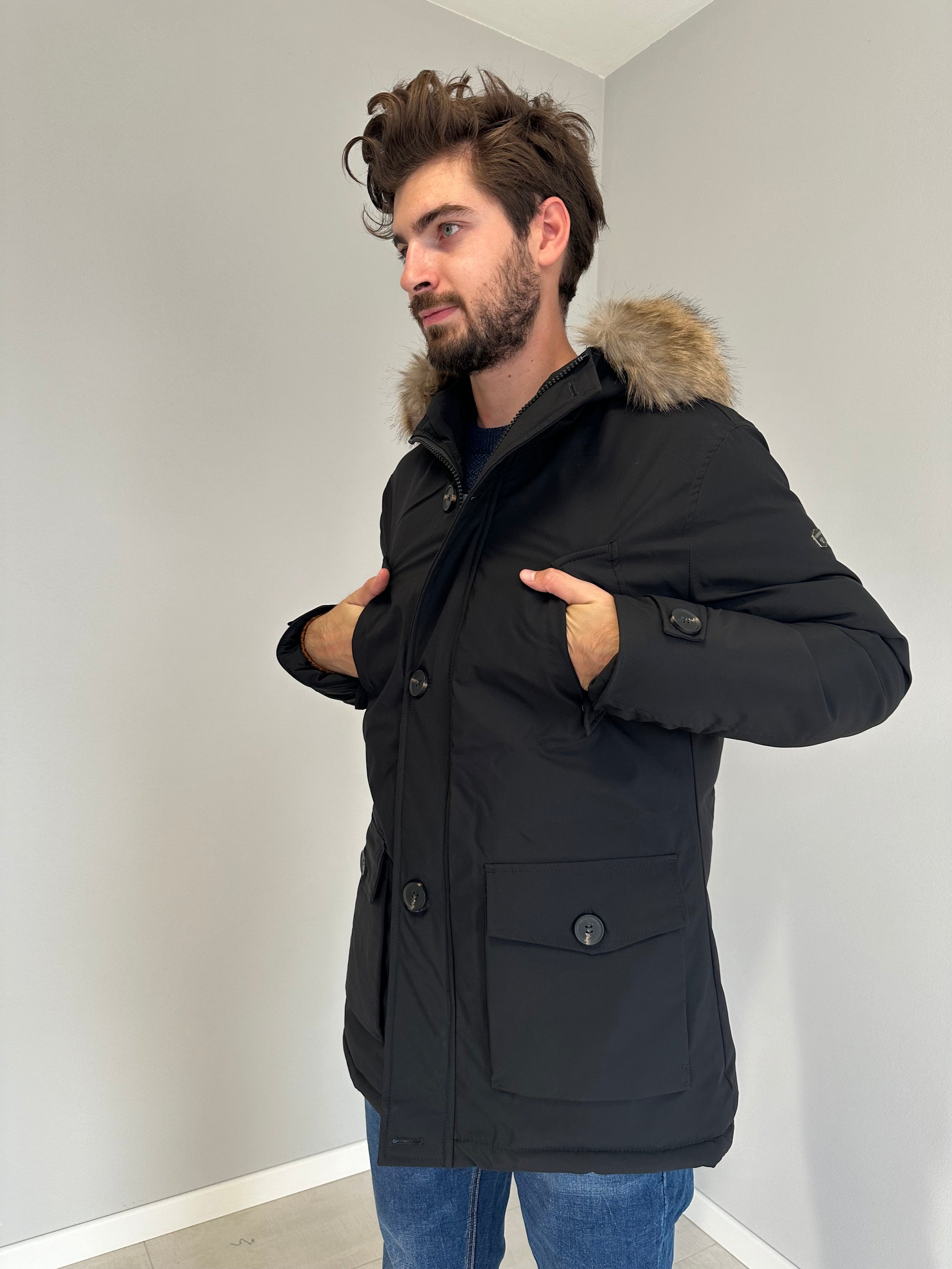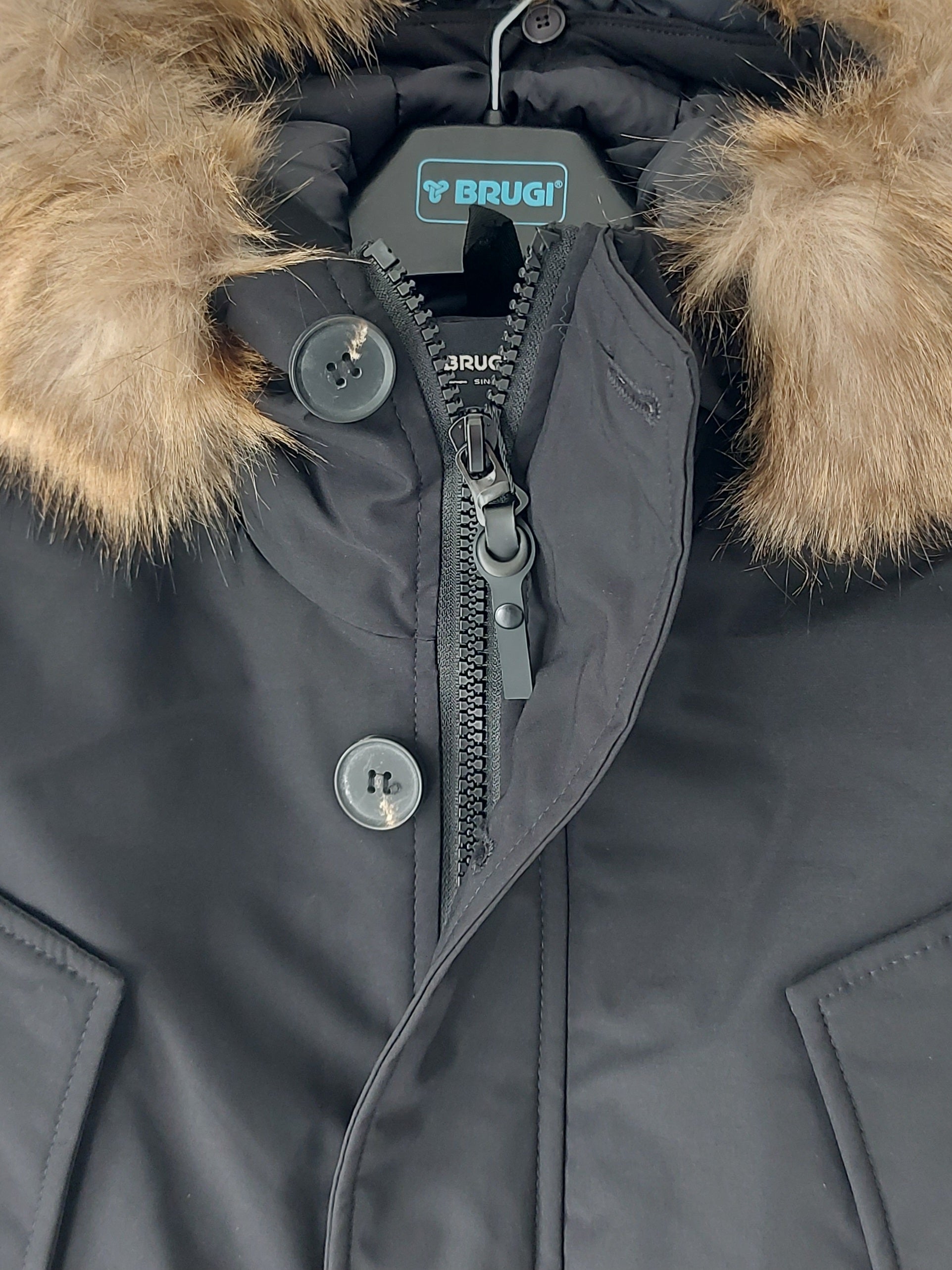 Giubbotto Nero Brugi con Cappuccio di Pelo e Tasche CY46