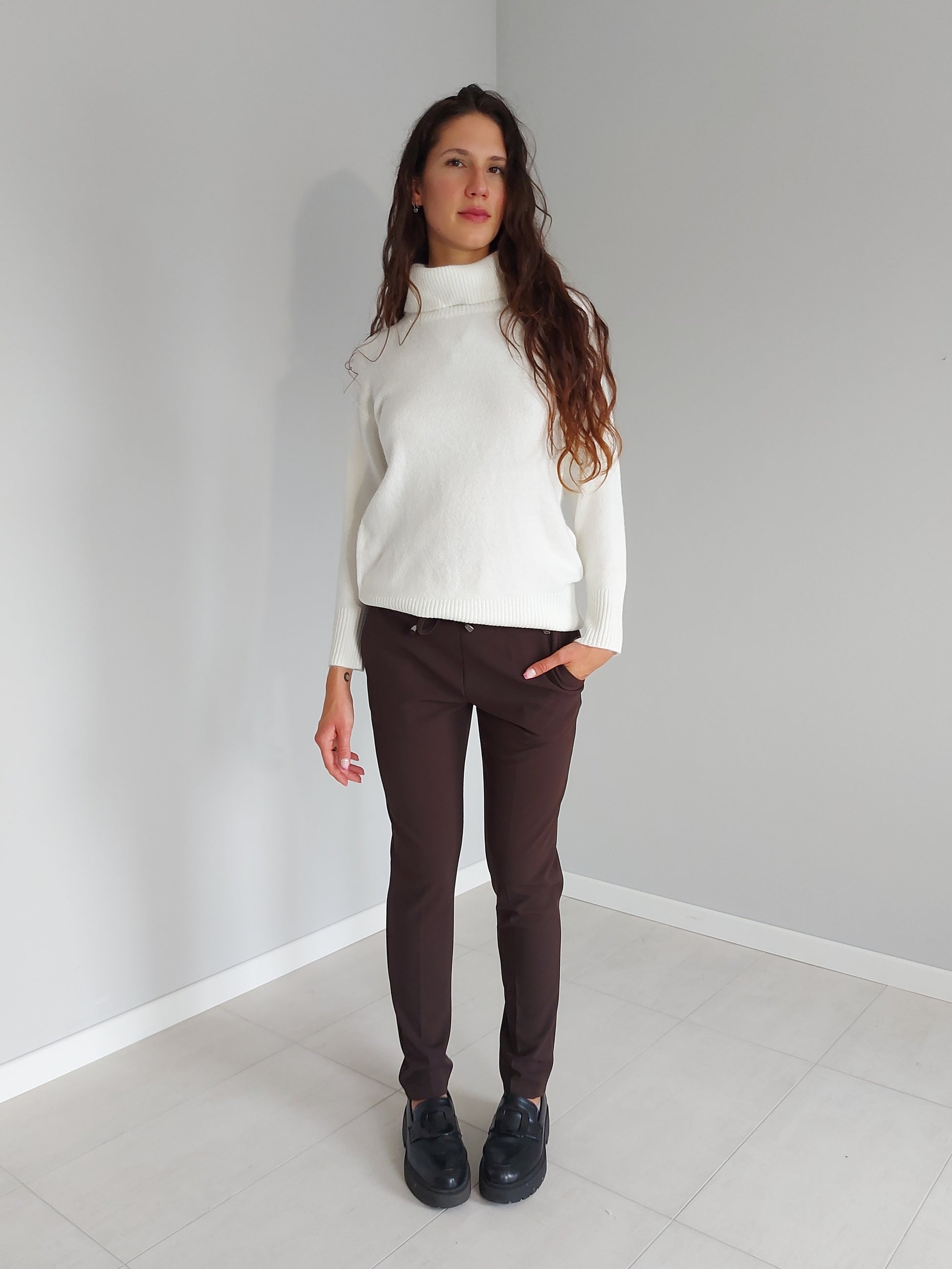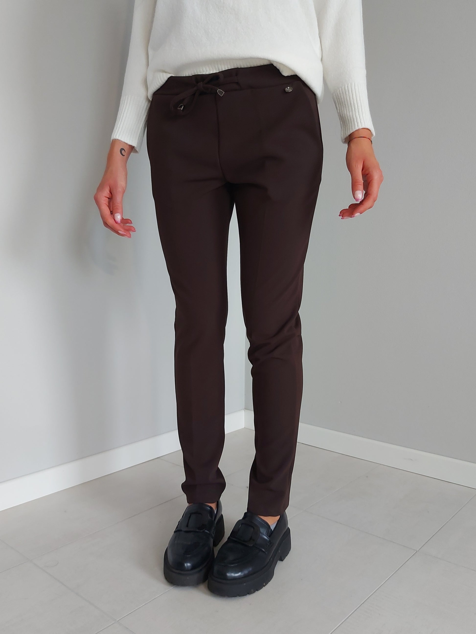 Questi pantaloni eleganti da donna, in una raffinata tonalità marrone scuro, offrono un perfetto equilibrio tra stile e comfort. Il taglio slim fit valorizza la figura, seguendo delicatamente le linee del corpo per una silhouette slanciata e sofisticata. La vita presenta un comodo elastico con coulisse, che aggiunge un tocco casual senza compromettere l'eleganza complessiva del capo.