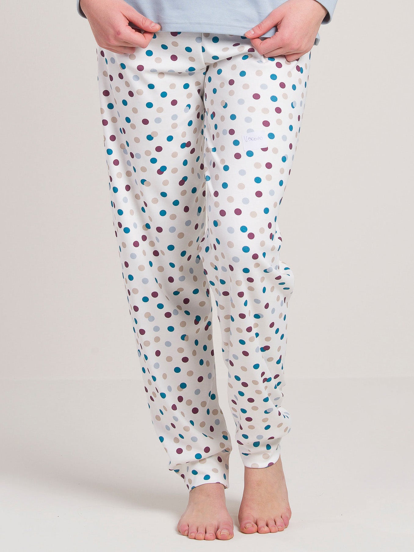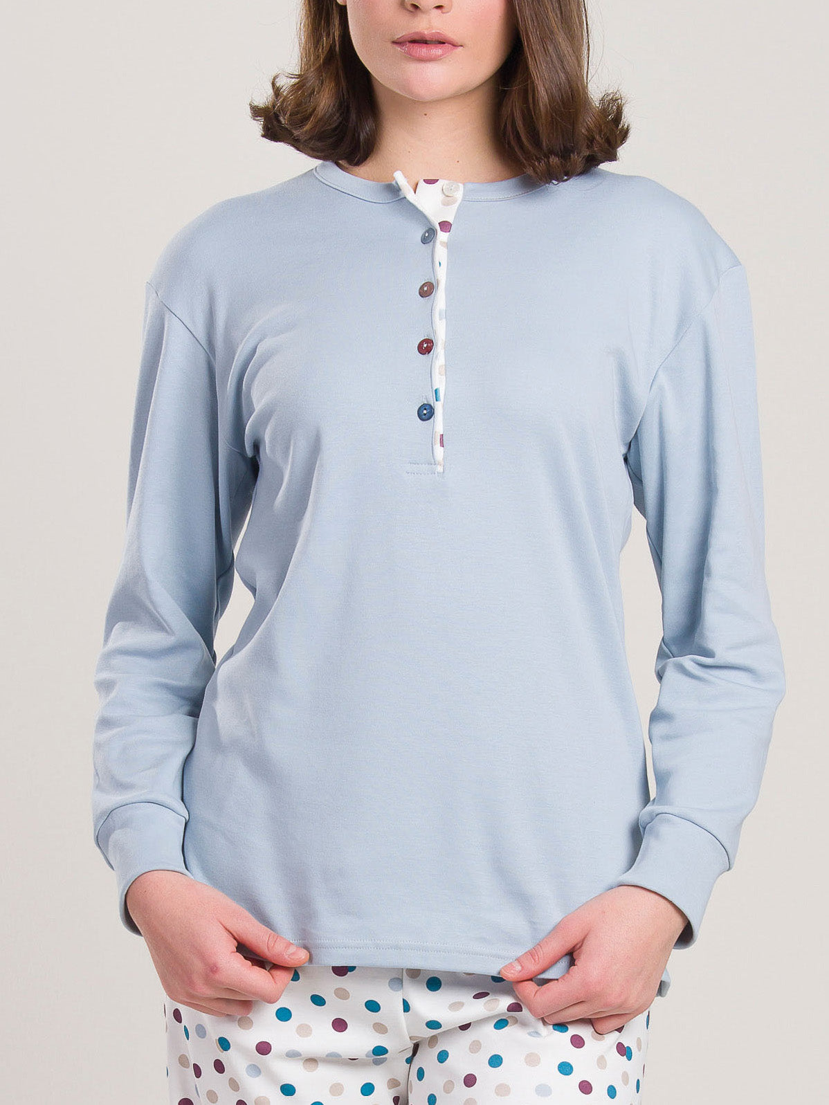 Concediti il massimo comfort con questo raffinato pigiama firmato Gary, pensato per coccolarti nelle serate di relax e durante il sonno. Realizzato con cura, questo completo combina uno stile casual e moderno con una vestibilità comoda. La maglia, in una delicata tonalità azzurra, è caratterizzata da un elegante scollo a serafino con bottoncini colorati che aggiungono un tocco di vivacità al design semplice ma sofisticato. I pantaloni, impreziositi da una stampa a pois multicolore, portano allegria al tuo guardaroba da notte, garantendo al contempo la massima libertà di movimento grazie alla morbida fascia in vita e alla linea rilassata.