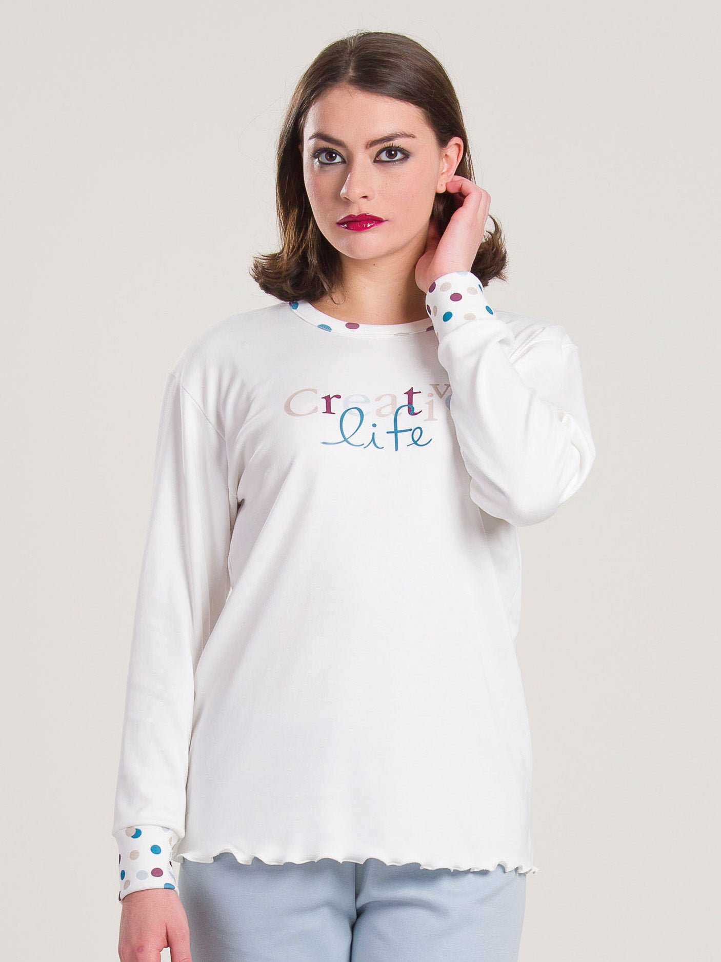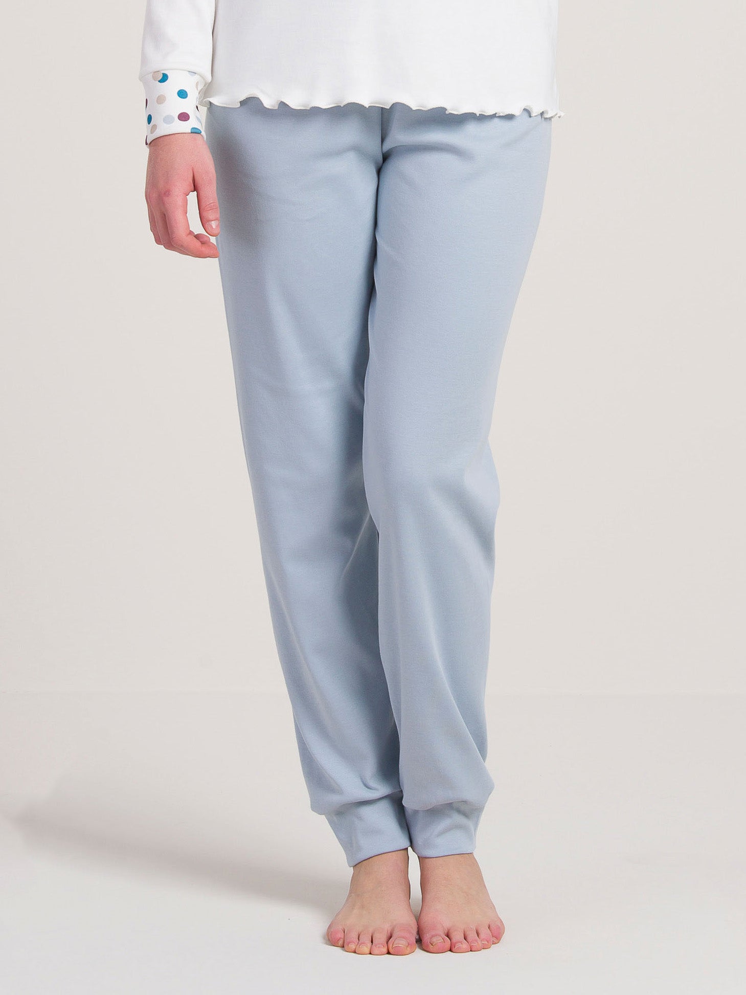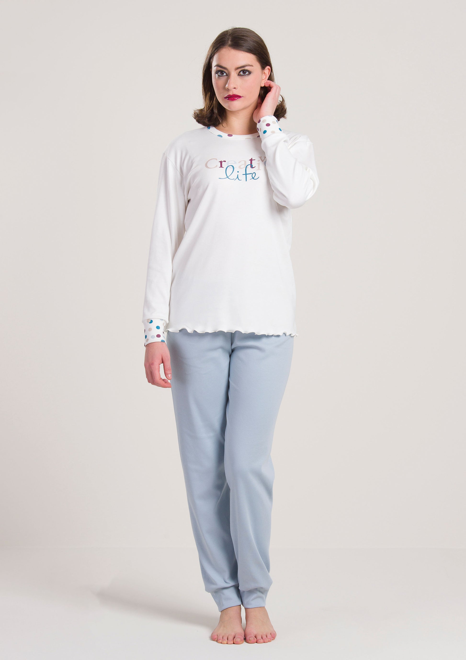 I pantaloni, con polso, completano questo set con un tocco di freschezza e femminilità. Realizzati in caldo cotone di alta qualità, questi pantaloni assicurano calore e morbidezza sulla pelle, accompagnandoti dolcemente nelle tue notti di relax.