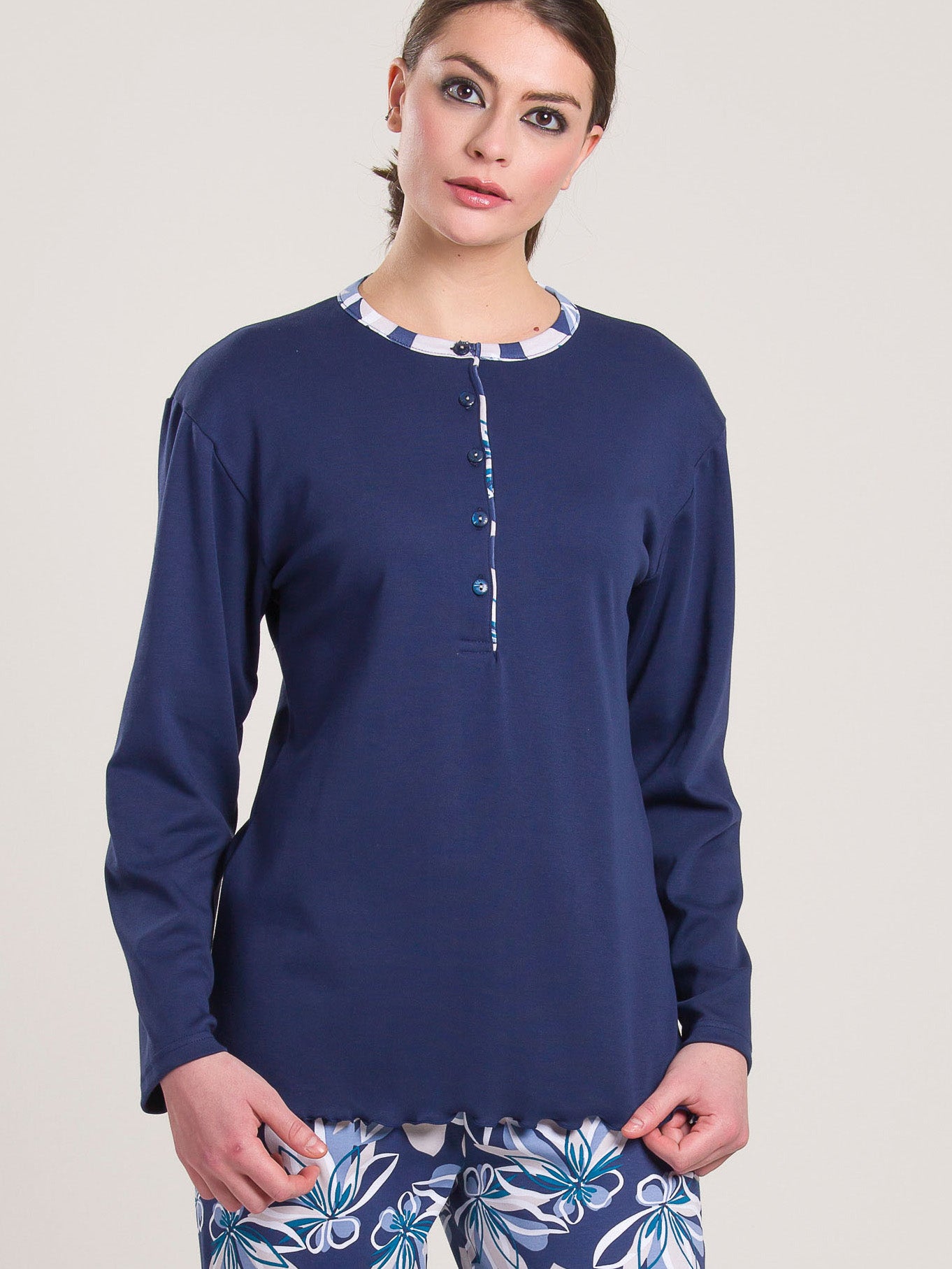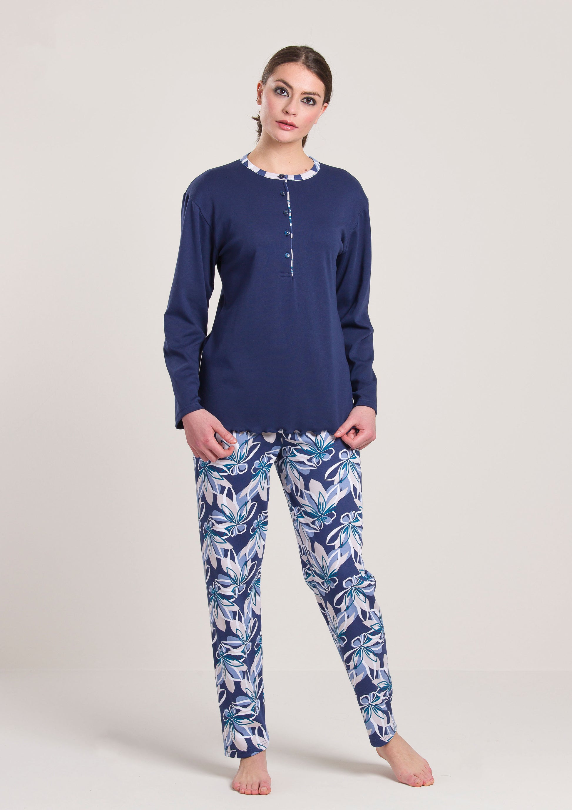 Concediti il massimo comfort con questo raffinato pigiama firmato Gary, pensato per coccolarti nelle serate di relax e durante il sonno. Realizzato con cura, questo completo combina uno stile casual e moderno. La maglia, in una delicata tonalità blu, è caratterizzata da un elegante scollo a serafino con bottoncini che aggiungono un tocco di vivacità al design semplice ma sofisticato. I pantaloni, impreziositi da una stampa a a fiori, portano allegria al tuo guardaroba da notte, garantendo al contempo la massima libertà di movimento grazie alla morbida fascia in vita e alla linea rilassata.