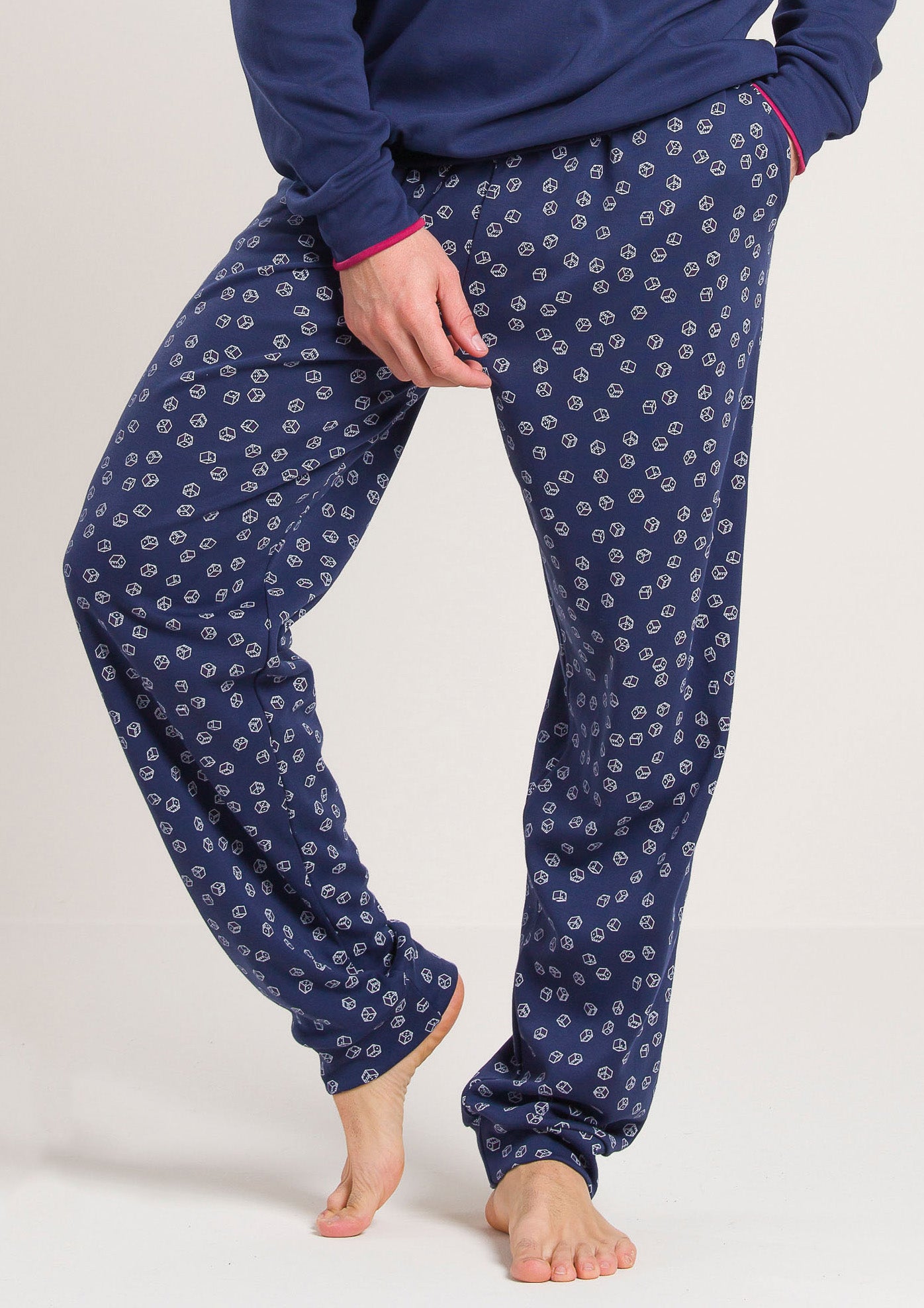 I pantaloni, con polso e stampa di dadi, completano questo set con un tocco di freschezza. Realizzati in caldo cotone di alta qualità, questi pantaloni assicurano calore e morbidezza sulla pelle, accompagnandoti dolcemente nelle tue notti di relax.