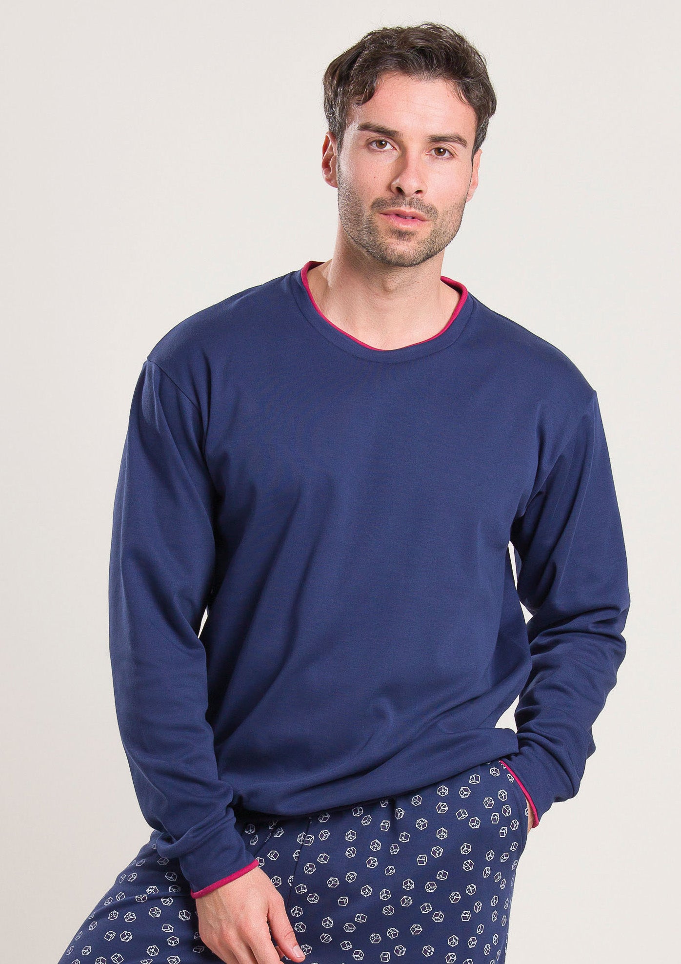Immergiti in un comfort avvolgente con questo splendido pigiama in caldo cotone firmato Gary, pensato per le notti più fresche. La maglia, in una delicata tonalità blu, presenta un design raffinato con scollo rotondo impreziosito da fettuccina rossa. Le maniche lunghe e il taglio morbido garantiscono una vestibilità comoda e rilassata, perfetta per goderti ogni momento di riposo con eleganza.