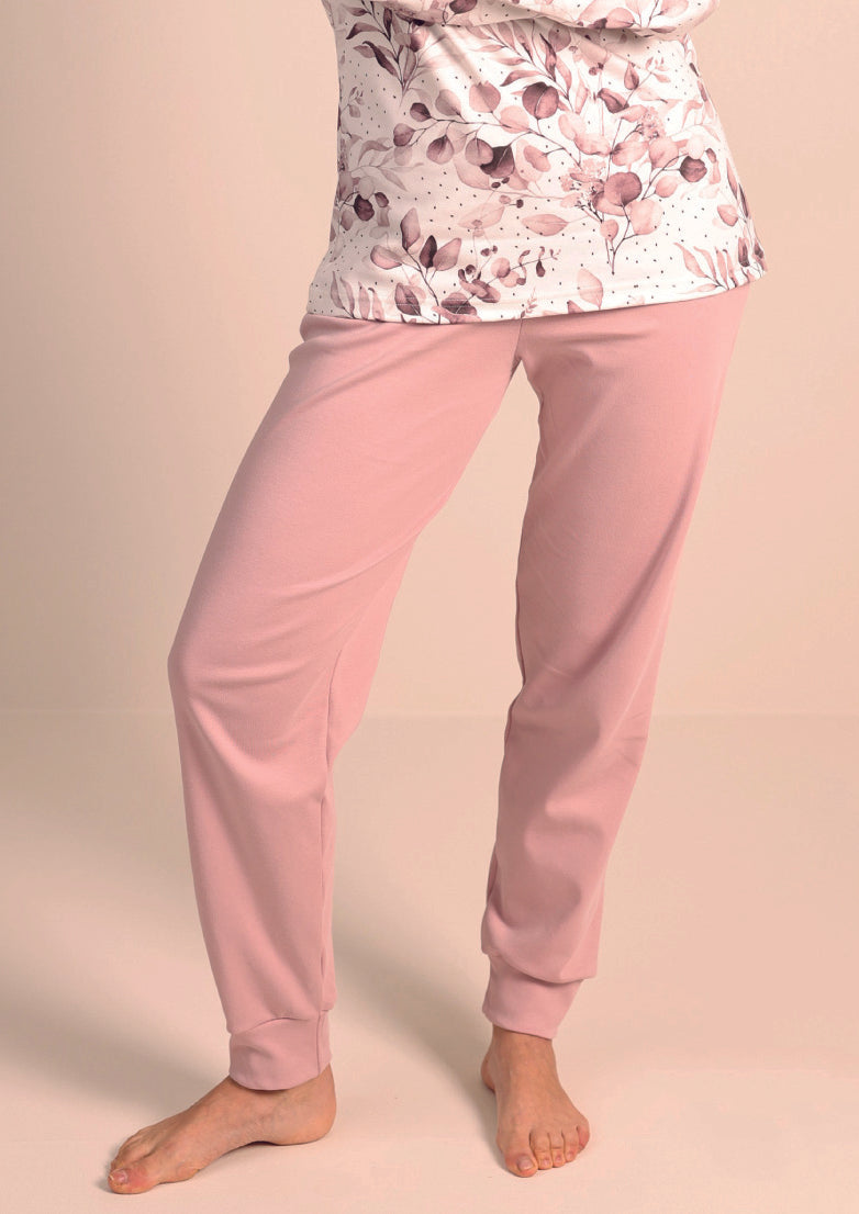 Avvolgente, comodo e perfetto per le serate fredde: questo pigiama da donna in caldo cotone unisce praticità e stile. La maglia in fantasia colorata aggiunge un tocco vivace e femminile, mentre il pantalone tinta unita con polsino alla caviglia garantisce una vestibilità ottimale, restando fermo senza salire durante la notte.
