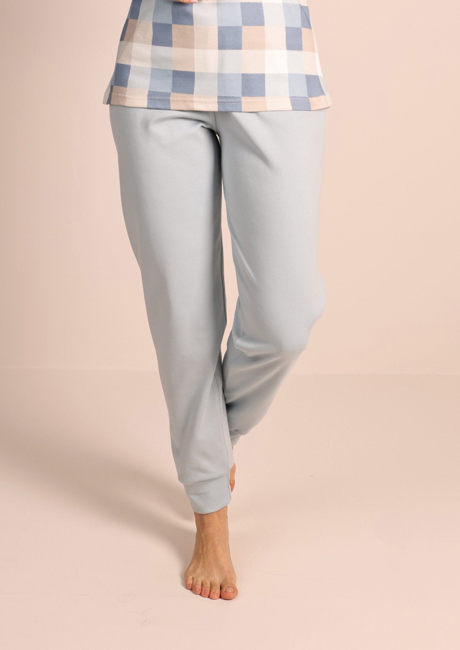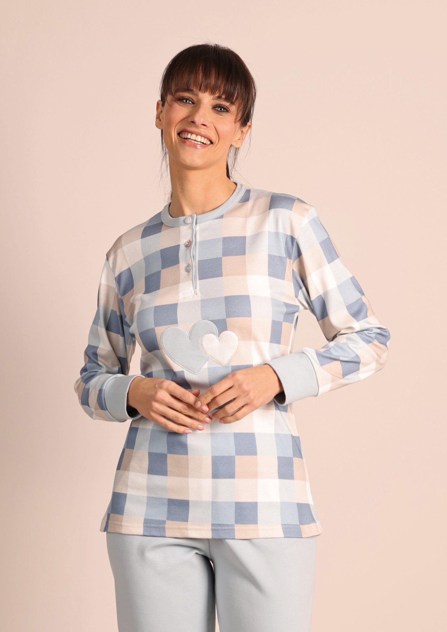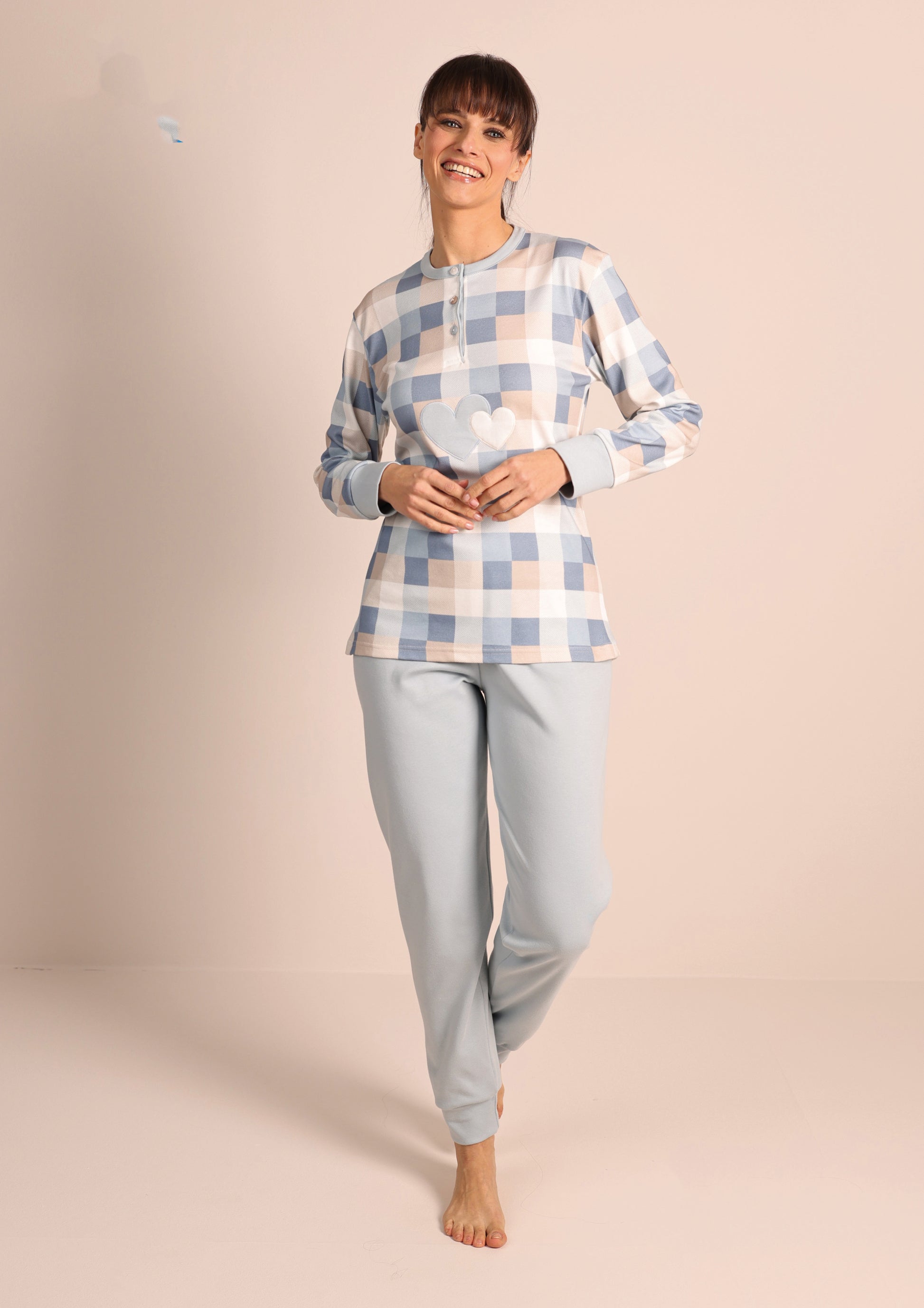 Avvolgente, comodo e perfetto per le serate fredde: questo pigiama da donna in caldo cotone unisce praticità e stile. La maglia in fantasia colorata aggiunge un tocco vivace e femminile, mentre il pantalone tinta unita con polsino alla caviglia garantisce una vestibilità ottimale, restando fermo senza salire durante la notte.