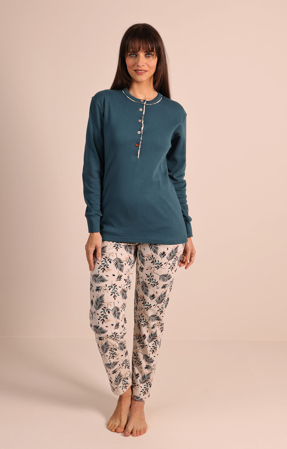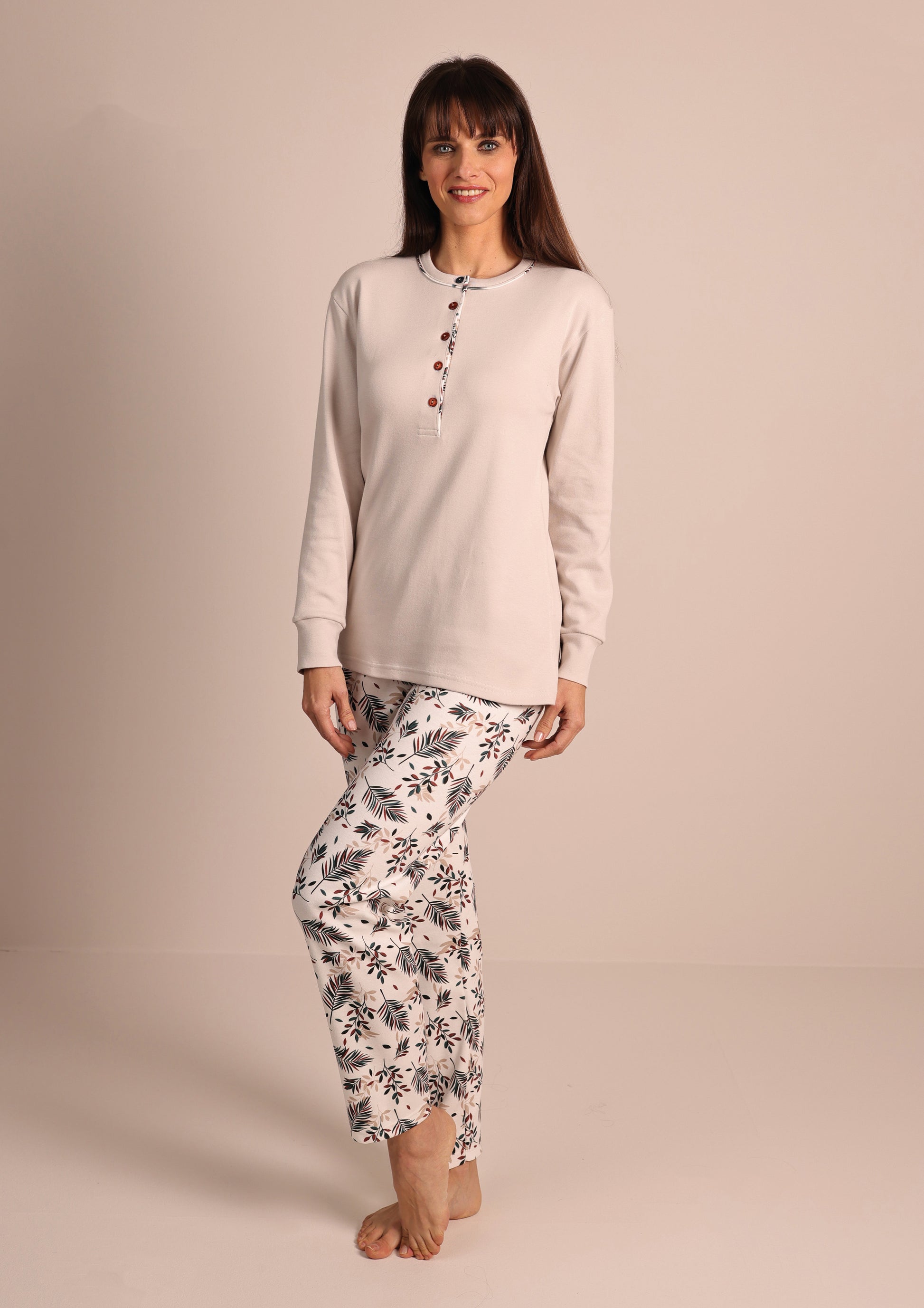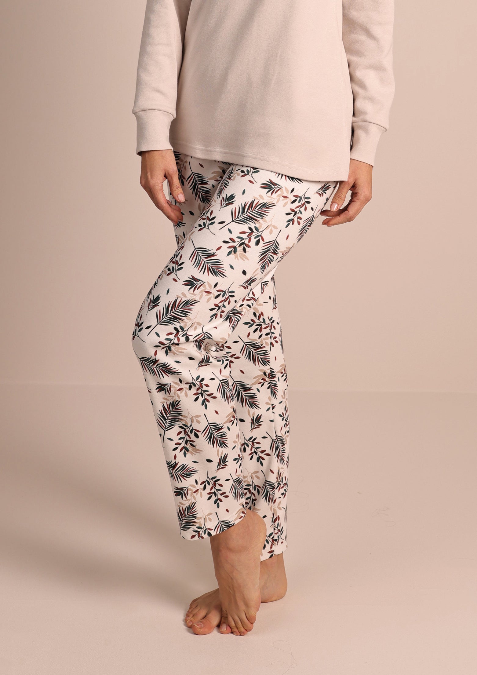 I pantaloni, con una stampa floreale delicata e romantica, completano questo set con un tocco di freschezza e femminilità. Realizzati in caldo cotone di alta qualità, questi pantaloni assicurano calore e morbidezza sulla pelle, accompagnandoti dolcemente nelle tue notti di relax.