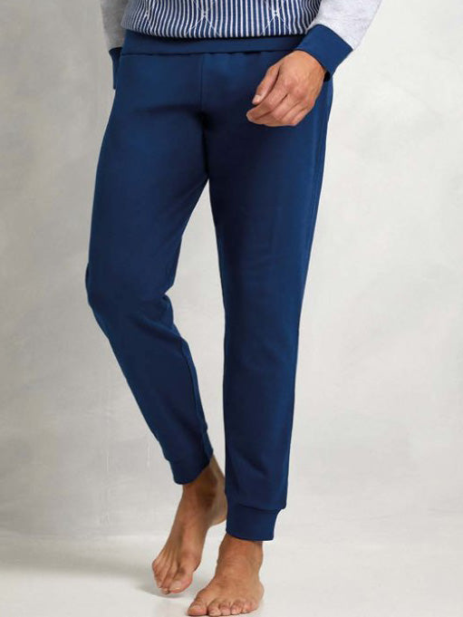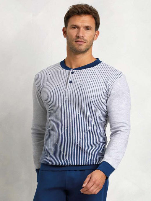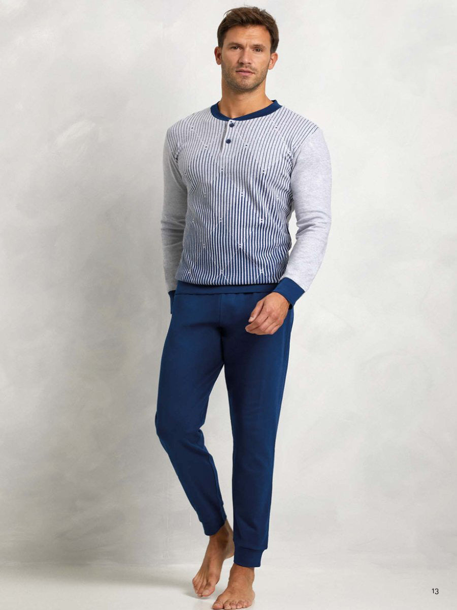 Realizzato in caldo cotone, questo pigiama offre una sensazione di morbidezza e calore, ideale per le notti più fredde. La maglia presenta un comodo scollo a serafino con bottoni e stampa sul petto, che aggiungono un tocco pratico senza rinunciare allo stile. I pantaloni sono dotati di polsino alle caviglie, garantendo una vestibilità perfetta e massima libertà di movimento durante il riposo.