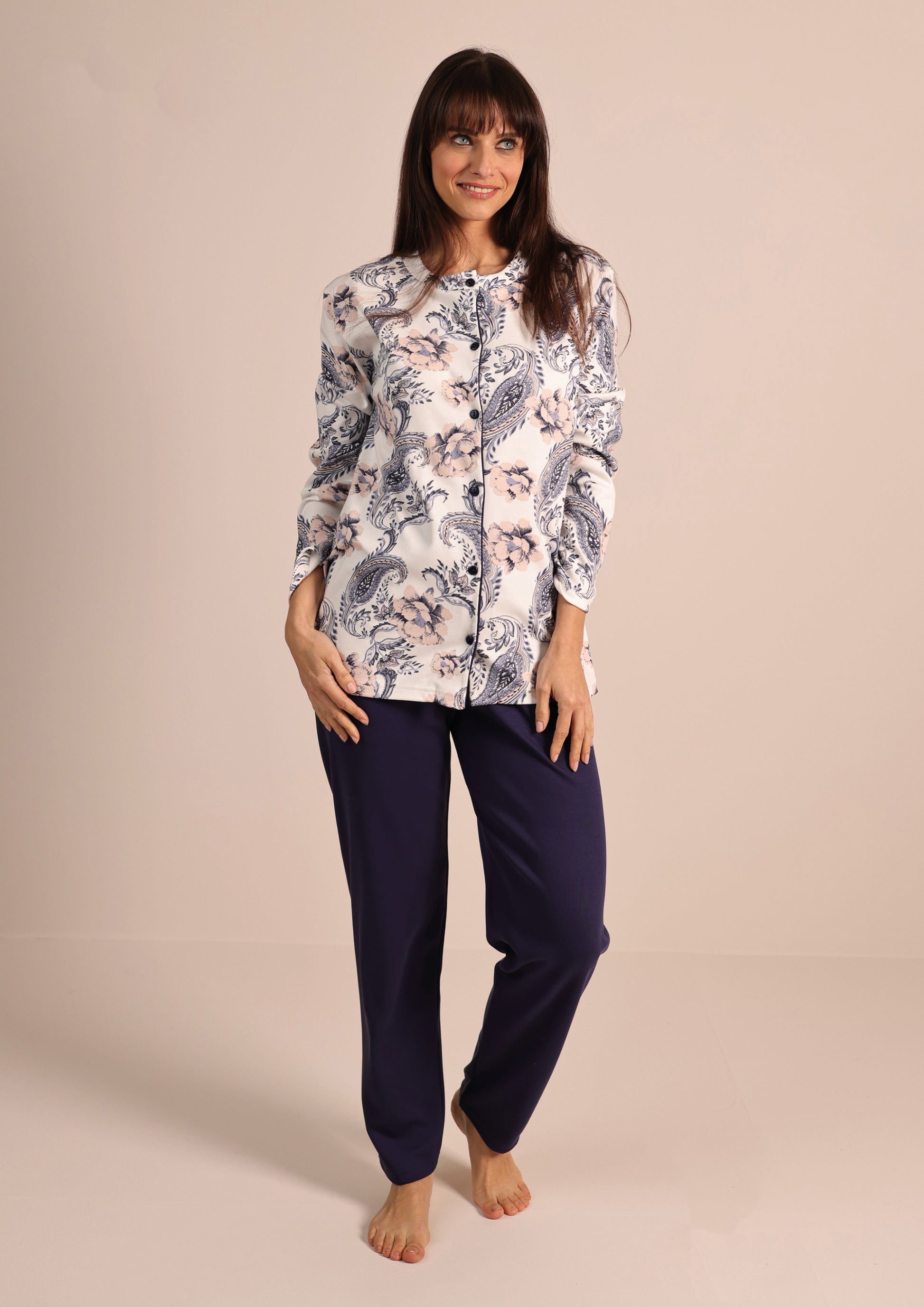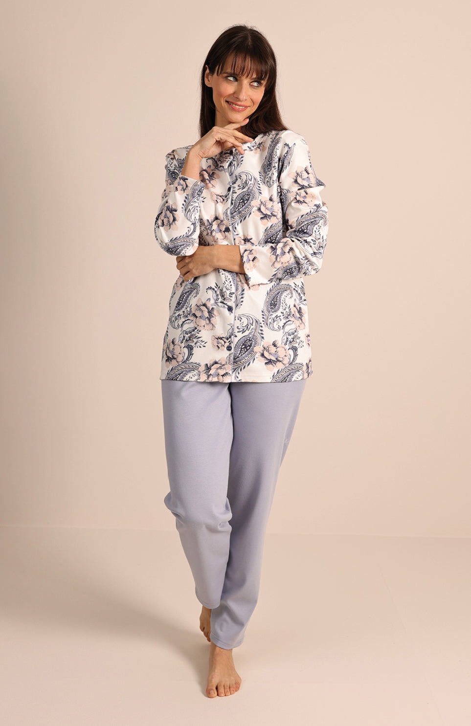 Confortevole, elegante e ideale per le stagioni più fresche, questo pigiama da donna in caldo cotone firmato Gary unisce praticità e stile. La maglia a maniche lunghe con abbottonatura frontale è impreziosita da una raffinata fantasia floreale e paisley, che dona un tocco femminile e ricercato anche ai momenti di relax.