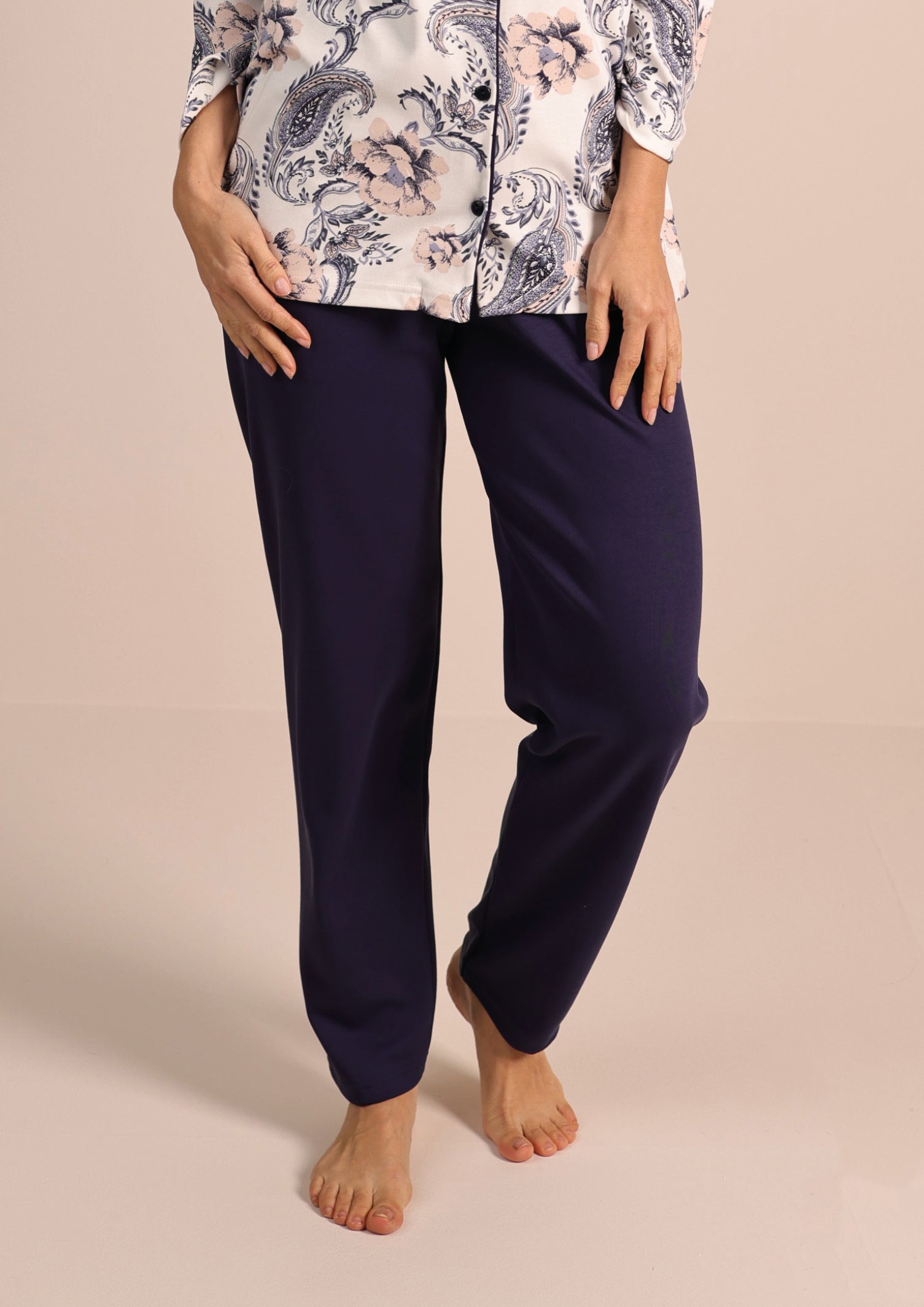 Il pantalone tinta unita con vestibilità morbida completa il look garantendo comodità e libertà di movimento, perfetto sia per dormire serenamente che per sentirsi a proprio agio in casa.