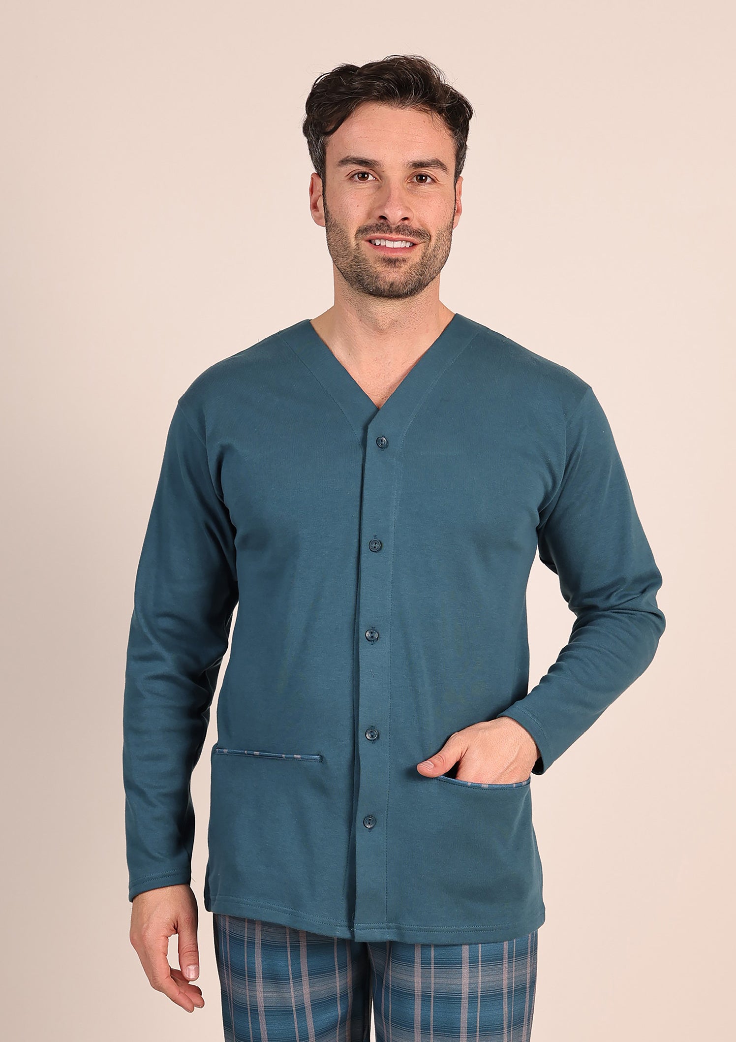 Pratico, confortevole e dal design moderno, questo pigiama da uomo in caldo cotone è la scelta ideale per affrontare le serate più fredde con stile. La maglia a maniche lunghe, tinta unita con apertura centrale con bottoni e taschine, offre un tocco classico e intramontabile.