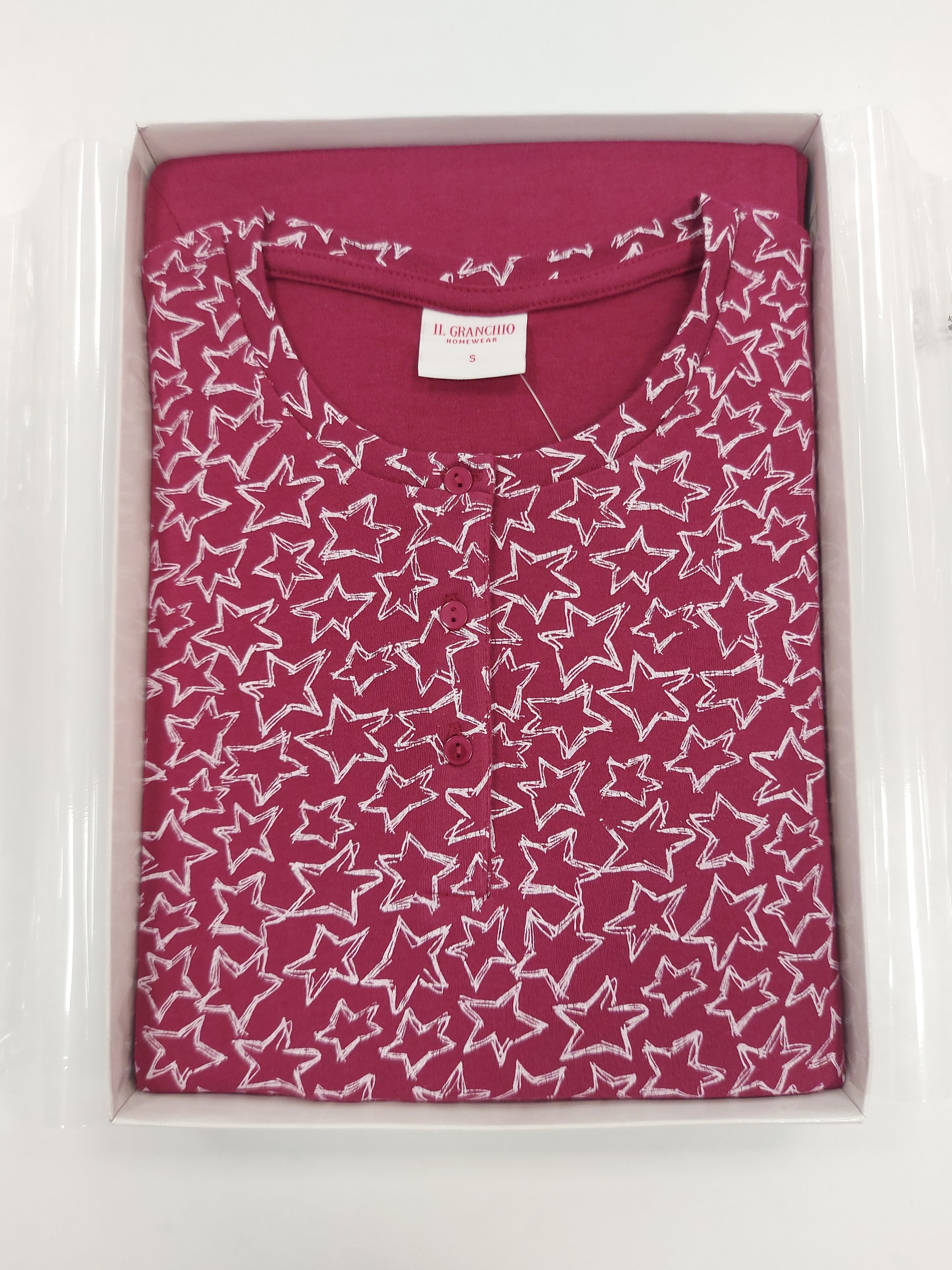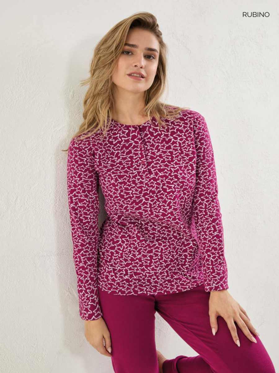 Per chi ama il lusso e l’eleganza anche nei momenti di relax, Il Granchio propone questo pigiama in caldo cotone, arricchito da una stampa con stelle che aggiungono un tocco di femminilità. Uno stile casual, per il completo pigiama pantalone slim con polso e maglietta con bottoni, che combinano praticità e stile, perfetto per rilassarsi a casa con un tocco di raffinatezza.