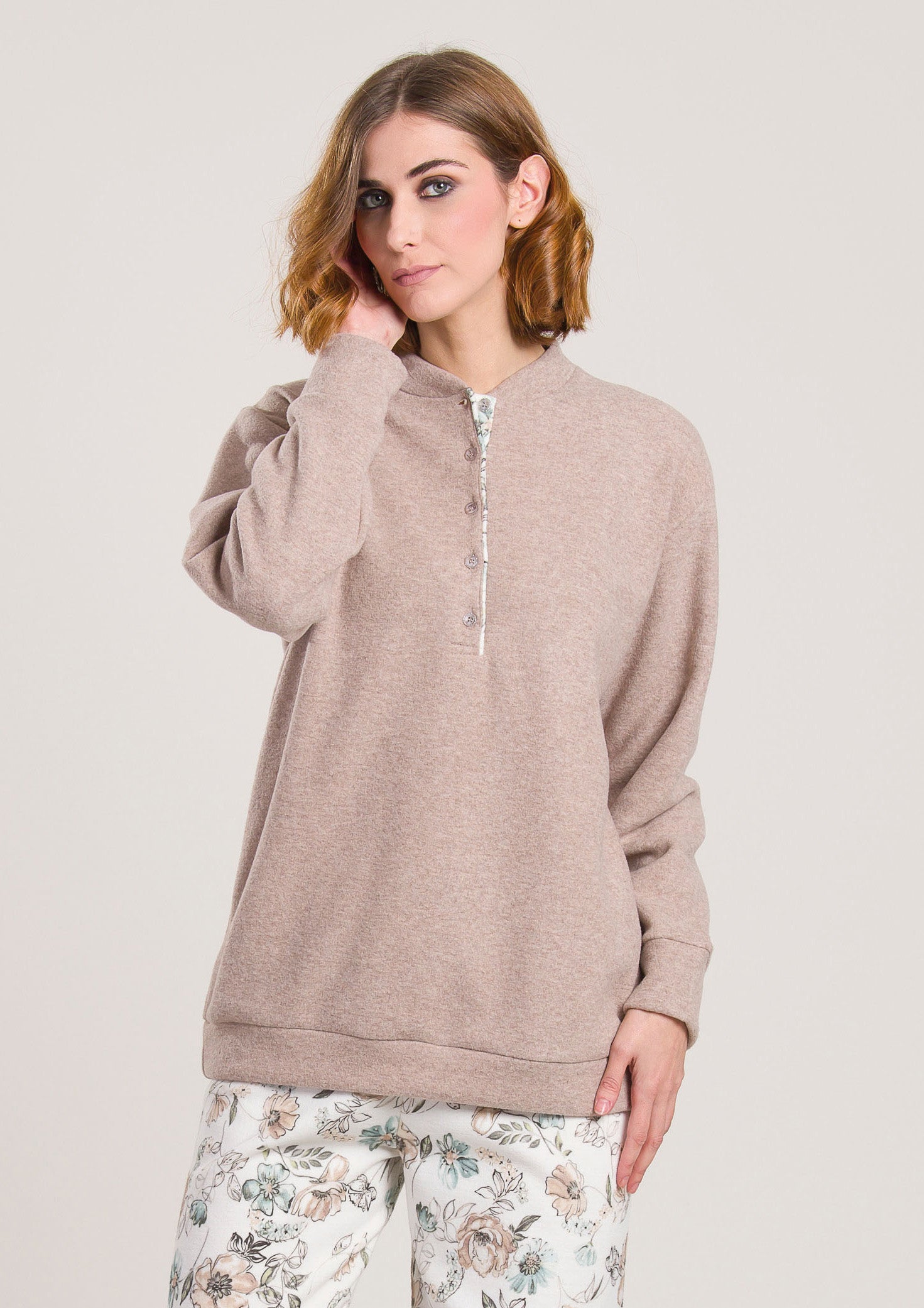 Scopri il piacere di avvolgerti in questo meraviglioso pigiama donna in tessuto Punto Milano super morbido, ideale per le fredde serate invernali. La maglia a maniche lunghe in un raffinato rosa tenue è impreziosita da una pratica chiusura con bottoni, che dona un tocco di classe e semplicità. I pantaloni con stampa floreale su fondo bianco aggiungono una nota romantica e delicata, creando un look femminile e rilassato, perfetto per coccolarsi con stile.