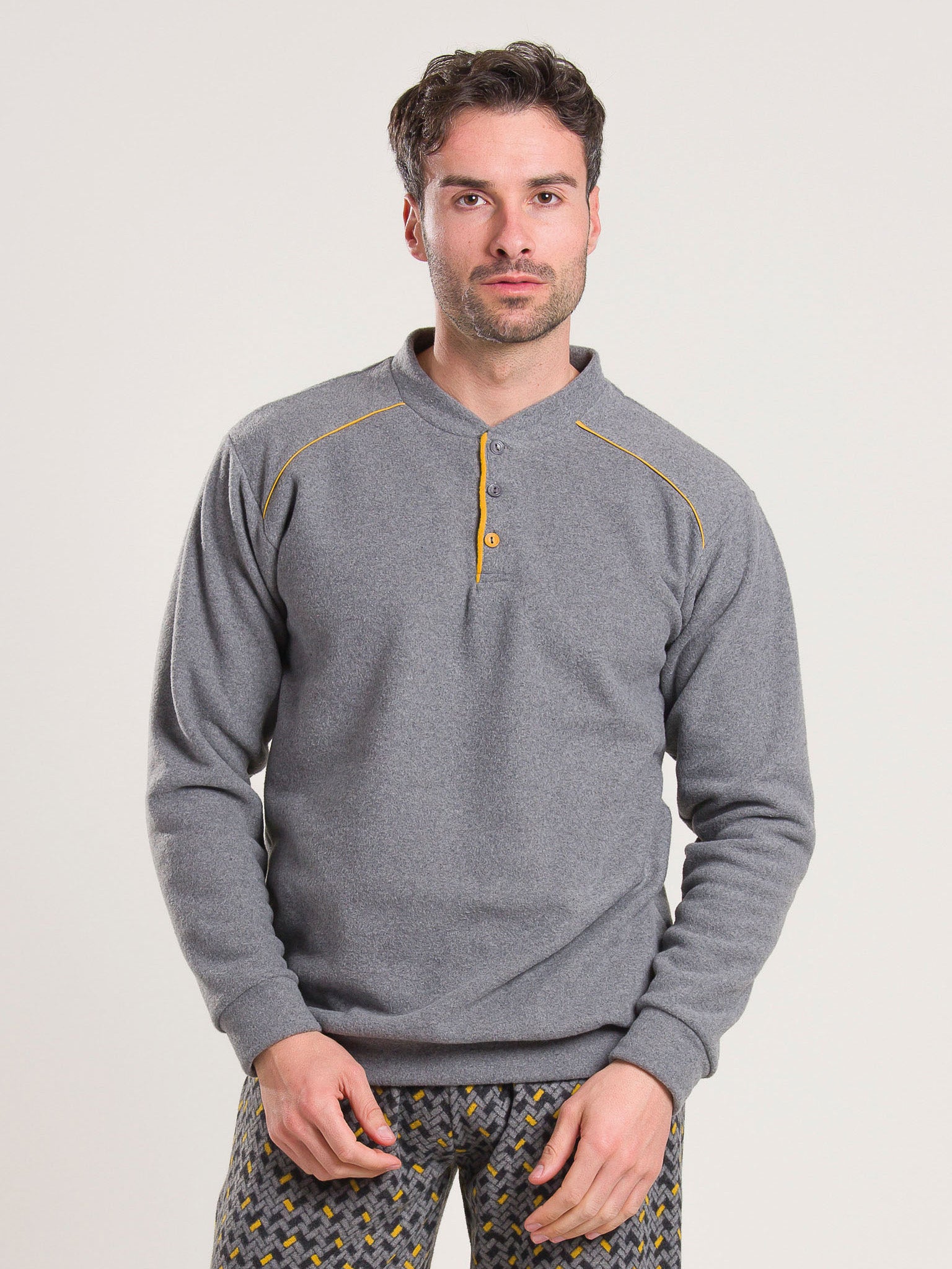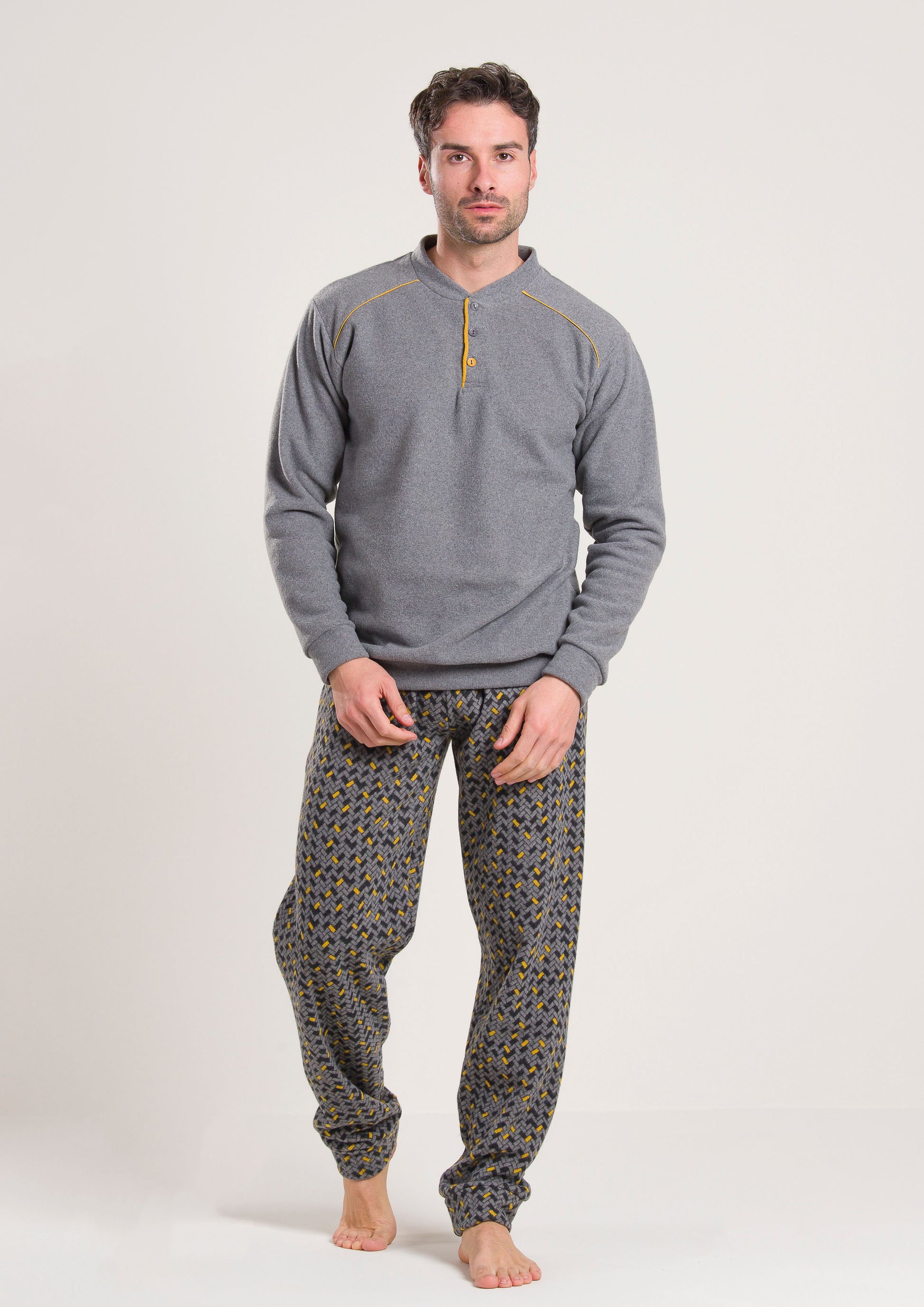 Lasciati avvolgere dal comfort avvolgente e caldo di questo pigiama Gary, pensato per l’uomo che non rinuncia allo stile nemmeno a casa. La maglia a maniche lunghe in felpa grigia, con un raffinato dettaglio a bottoni e cuciture a contrasto, unisce praticità e design, per una vestibilità impeccabile e moderna. I pantaloni, con una stampa geometrica accattivante, spezzano la monotonia con un tocco di grinta, esaltando la tua personalità.