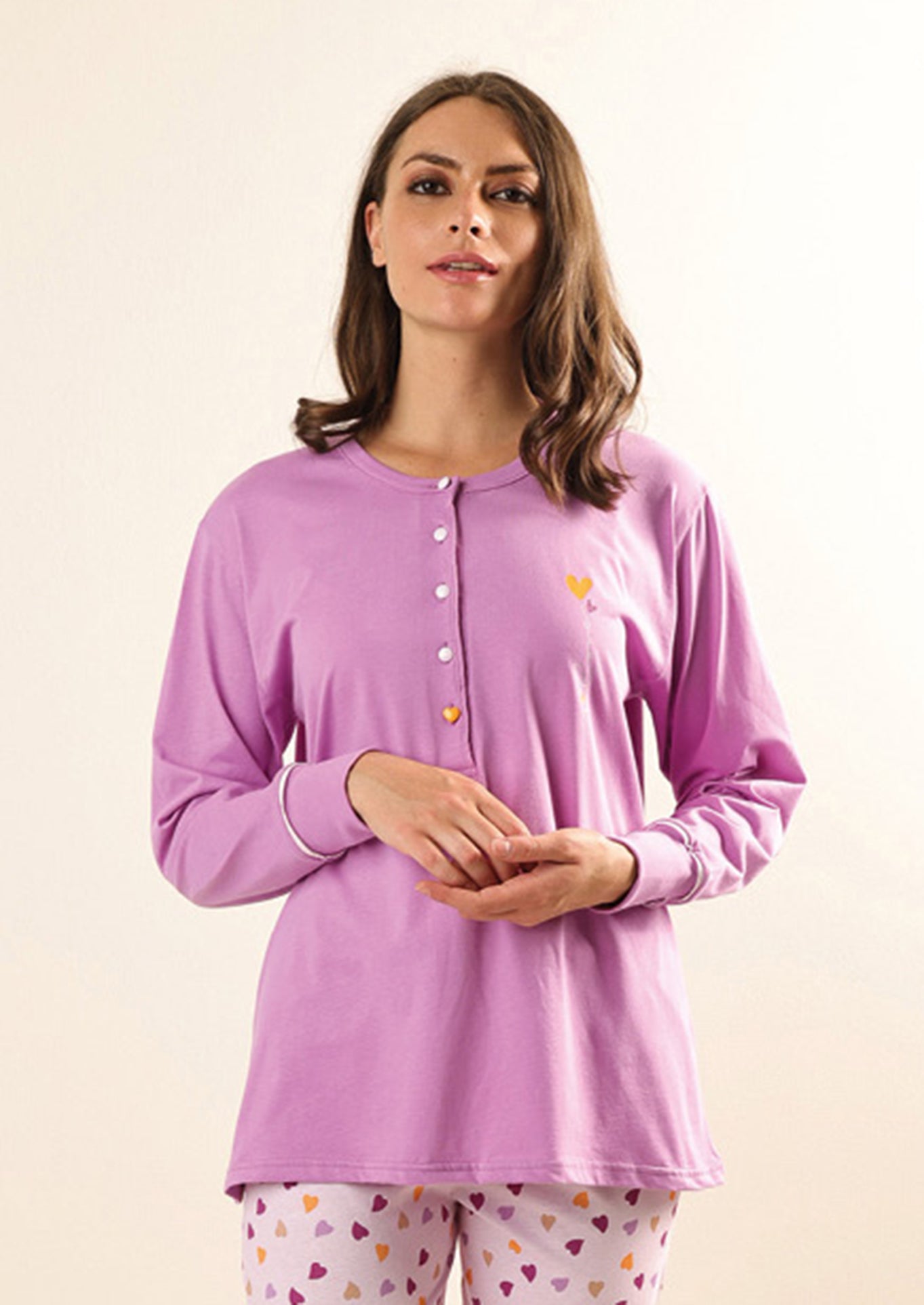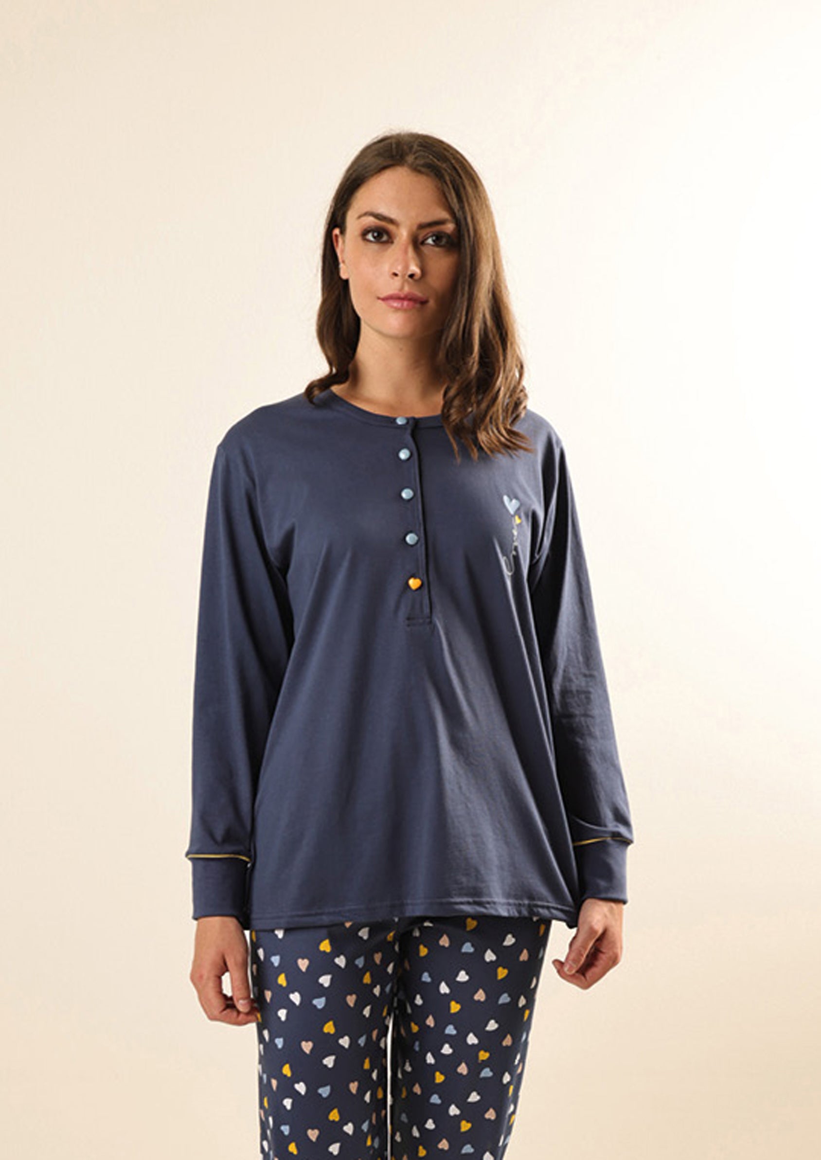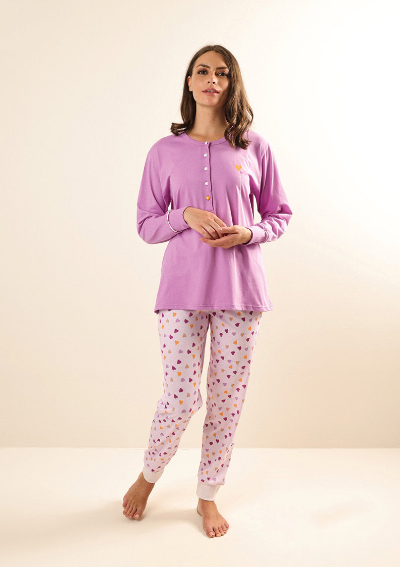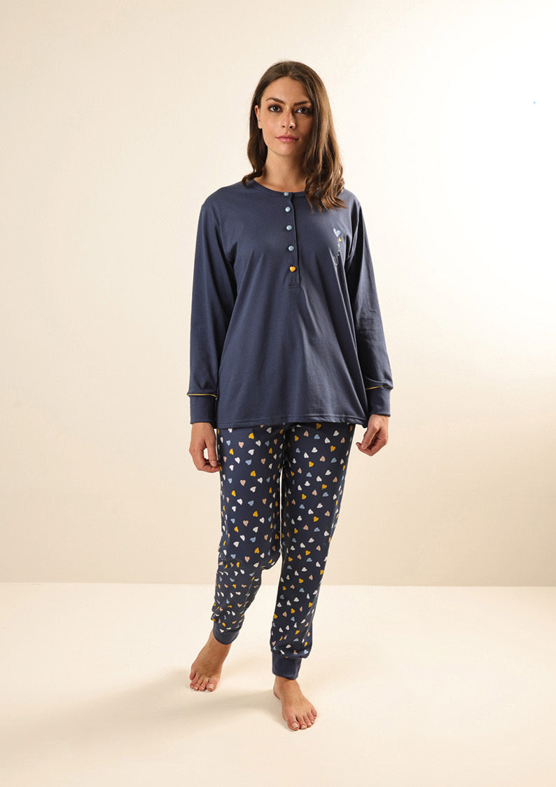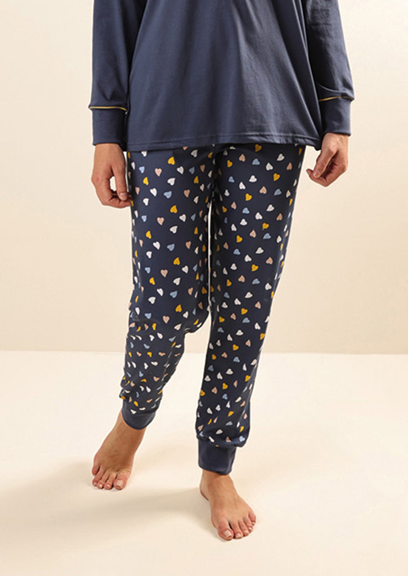 Il design classico e versatile si distingue per la maglia a manica lunga con scollo serafino, che aggiunge un tocco di eleganza casual e praticità. I pantaloni sono dotati di polsini elasticizzati alle caviglie, perfetti per garantire una vestibilità stabile e avvolgente senza risultare troppo stretti. Ideale per la stagione primaverile, questo pigiama offre il massimo della libertà di movimento senza rinunciare allo stile.
