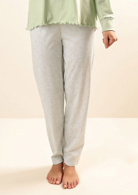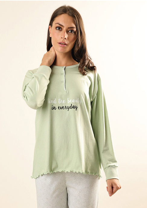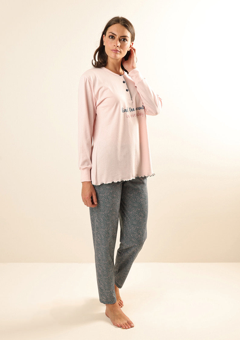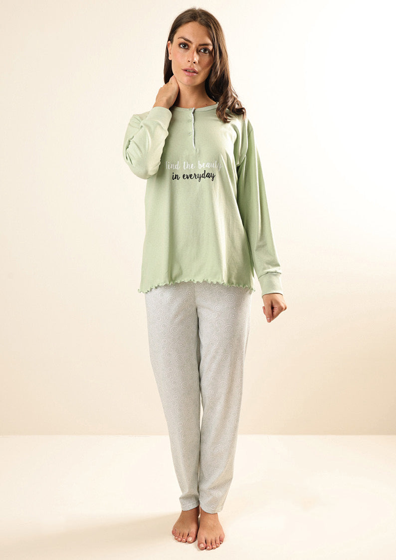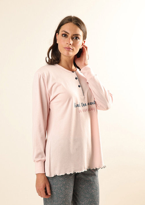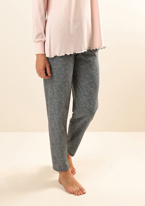 La maglia a manica lunga presenta uno scollo serafino con bottoncini, impreziosito da dettagli stampati che riprendono il motivo dei pantaloni. Il fondo arrotondato e i piccoli inserti decorativi donano un tocco femminile e sofisticato. I pantaloni, morbidi e confortevoli, sono caratterizzati da polsini elasticizzati alla caviglia per una vestibilità impeccabile e avvolgente.