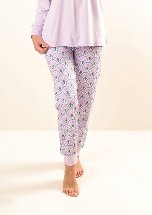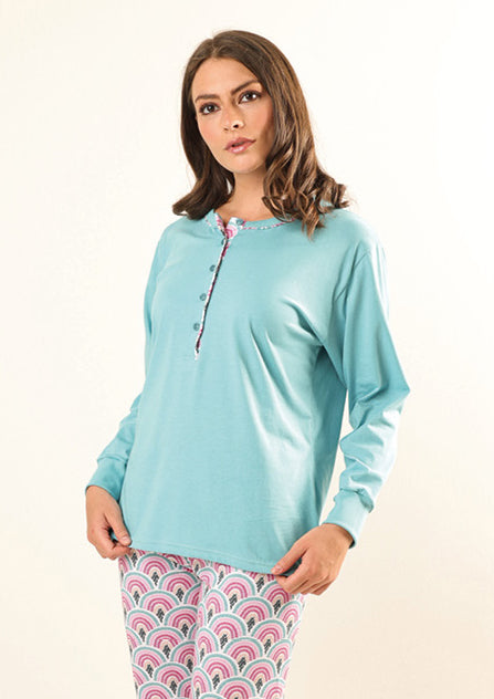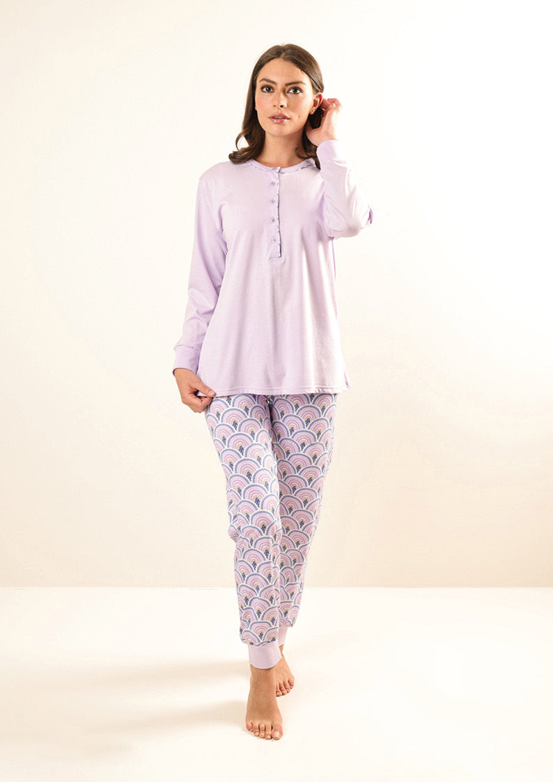 Il design classico e versatile si distingue per la maglia a manica lunga con scollo serafino, che aggiunge un tocco di eleganza casual e praticità. I pantaloni sono dotati di polsini elasticizzati alle caviglie, perfetti per garantire una vestibilità stabile e avvolgente senza risultare troppo stretti. Ideale per la stagione primaverile, questo pigiama offre il massimo della libertà di movimento senza rinunciare allo stile.