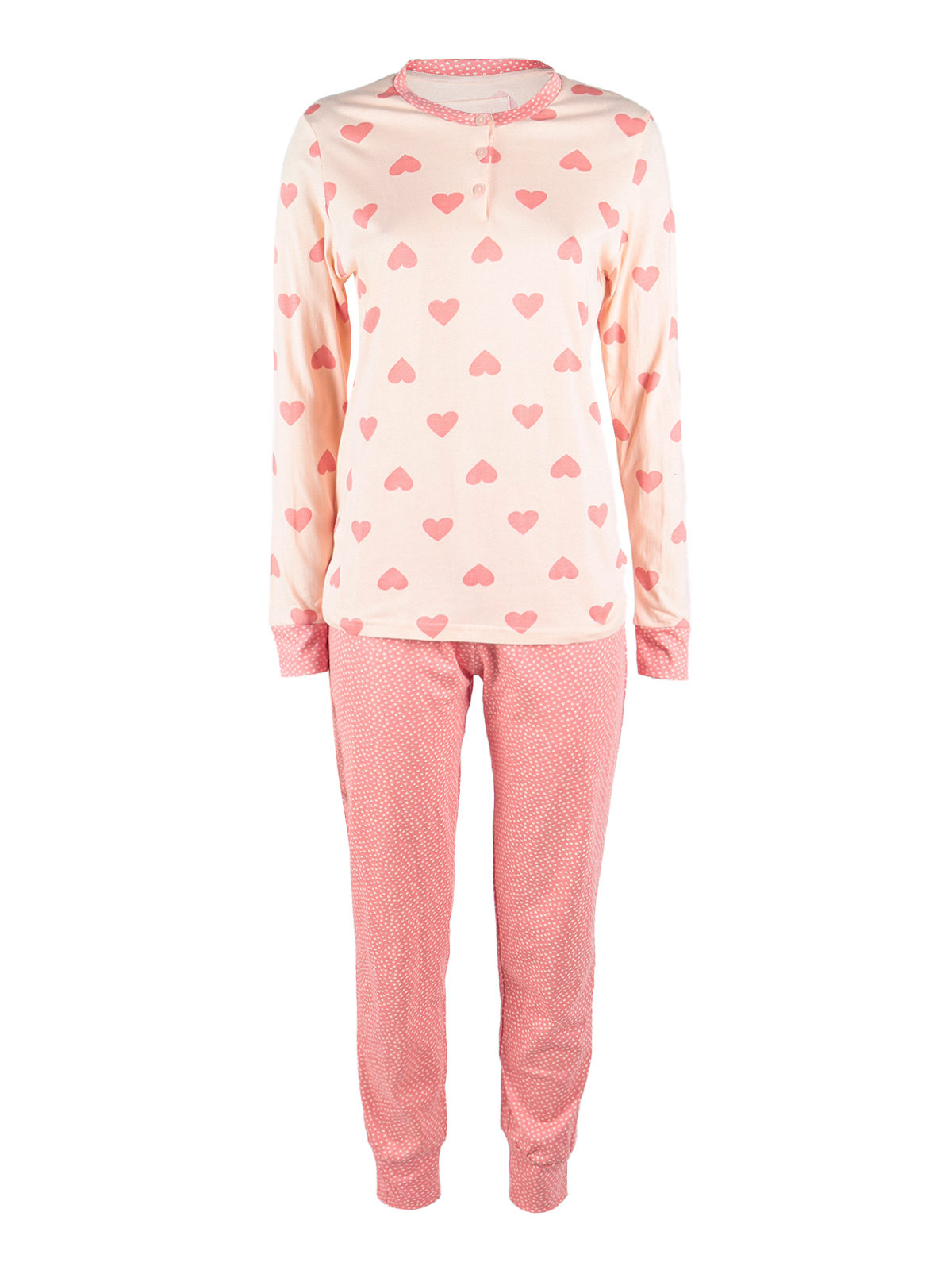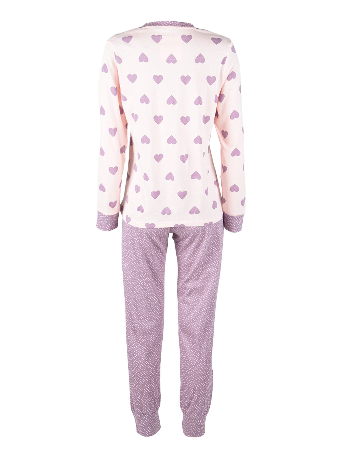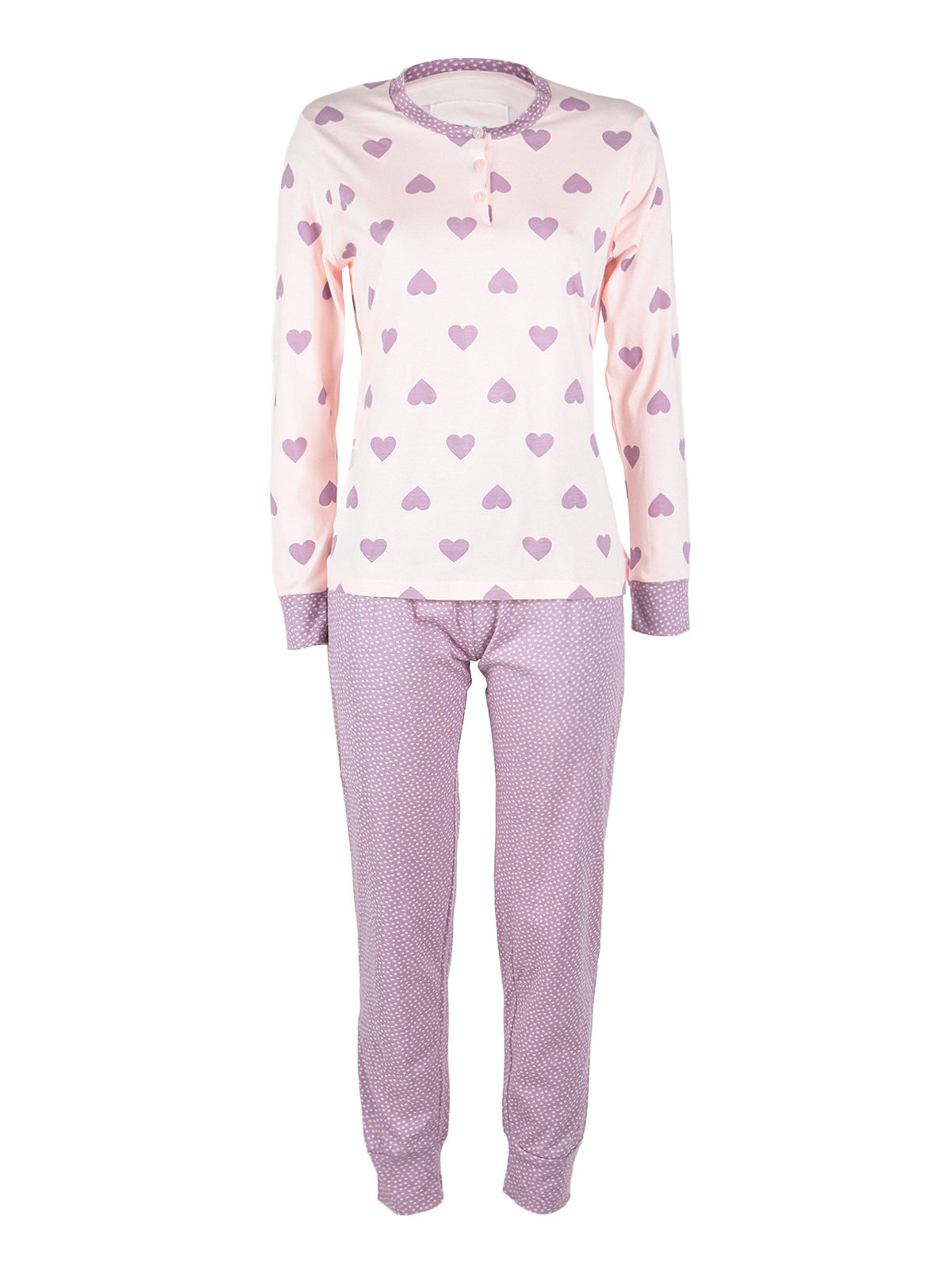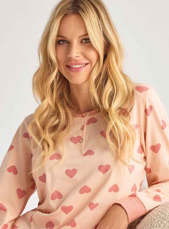 Il design romantico e femminile è caratterizzato da una dolce stampa a cuori, che dona un tocco di dolcezza e spensieratezza al tuo look da notte. La maglia a maniche lunghe presenta polsini elasticizzati e un raffinato scollo rotondo, mentre il pantalone, con una stampa micro pois in tinta, è dotato di caviglie elasticizzate per una vestibilità comoda e pratica.