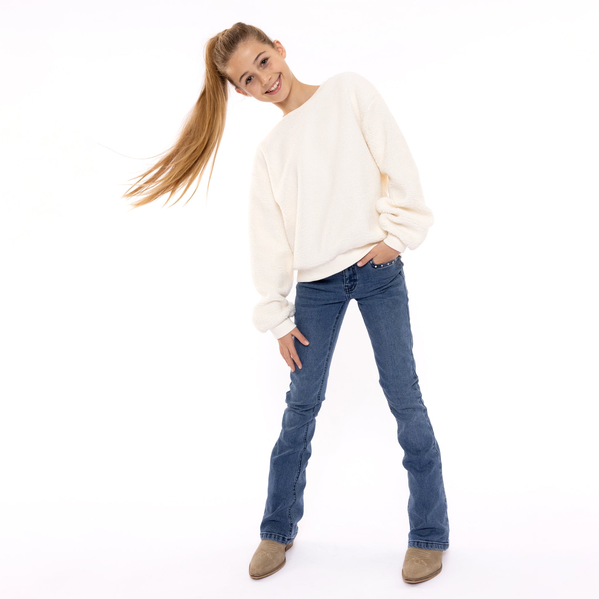 Questo maglione con tessuto effetto teddy firmato No Way Monday è l'alleato perfetto per le giornate fresche. Realizzato in un tessuto morbido e caldo, si distingue per il suo colore delicato e il tessuto agnellato, donando movimento e un tocco di stile boho-chic.