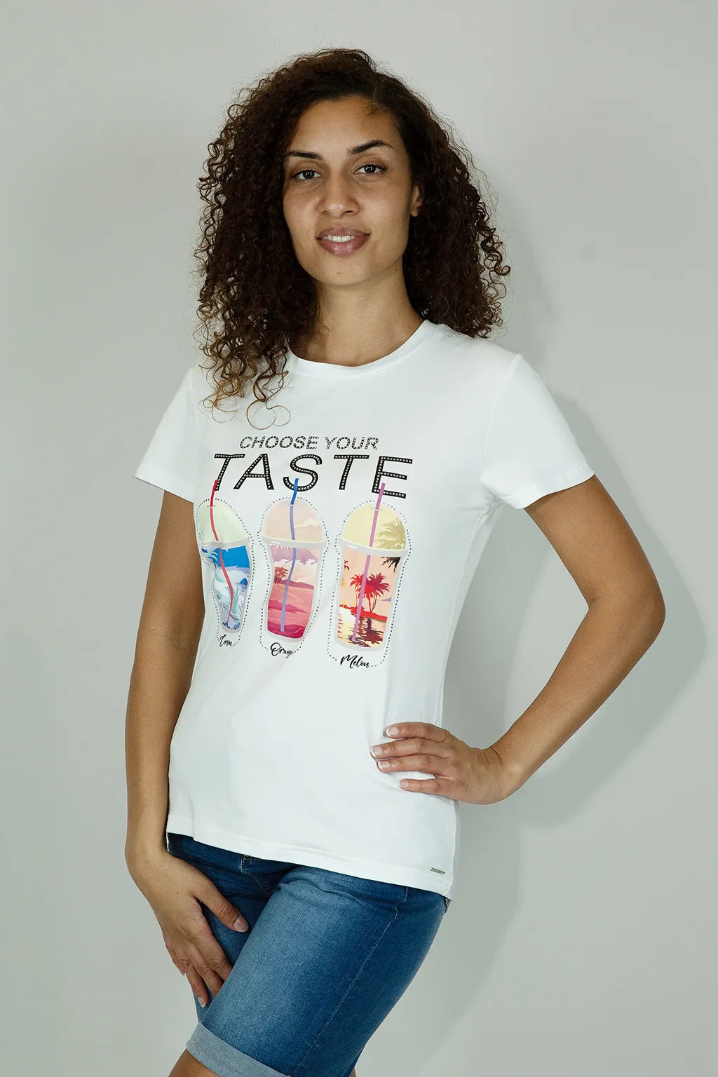 Maglietta donna in cotone elasticizzata con stampa e strass – Brugi