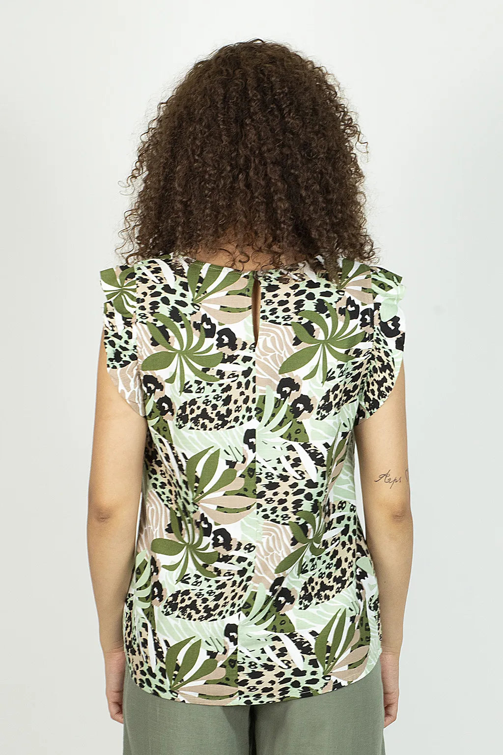 Esalta la tua femminilità con questo top da donna in fantasia tropicale, un capo dal fascino romantico e senza tempo. Realizzato in morbido tessuto di viscosa, è perfetto per le giornate più calde grazie alla sua leggerezza e traspirabilità.